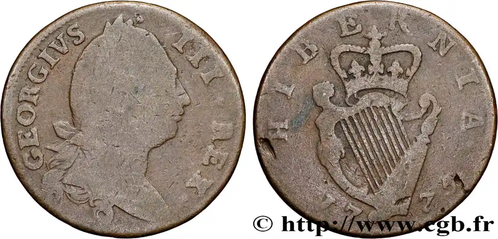 Type : 1 Penny Georges IIIDate : 1797Nom de l’atelier/ville : SohoMétal : cuivreDiamètre : 36 mmAxe des coins : 6 h.Poids : 27,70 g.Tranche : lisseRéférence ouvrage :Sp.3777  – KM/WC.18/618 AversTitulature avers : GEORGIUS III. D: G. REX.Description avers : Buste drapé et lauré de Georges III à droite.ReversTitulature revers : BRITANNIA / 1797.Description revers : Britannia assise à gauche.CommentaireGeorges III (1738-1820) est le petit-fils de Georges II et le fils de Frédéric-Louis (1707-1751), prince de Galles, et d’Augusta de Saxe Gotha. Il succéda à Georges II en 1760. Atteint de crises de démence de plus en plus prononcées, son fils Georges IV dut assurer la régence à partir de 1810.HistoriqueROYAUME-UNI
