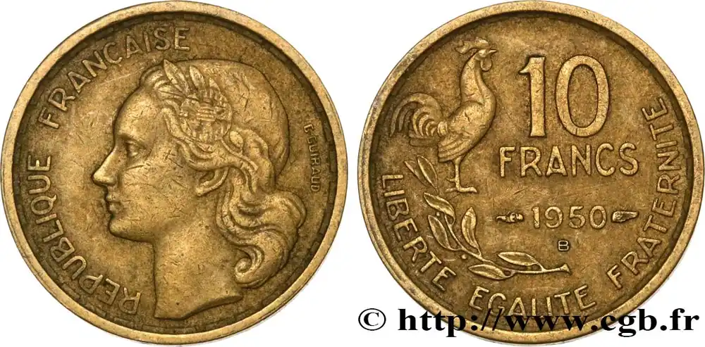 Type : 10 francs GuiraudDate : 1950Quantité frappée : 13.534.000Métal : bronze-aluminiumDiamètre : 20 mmAxe des coins : 6 h.Poids : 3,07 g.Tranche : lisseRéférence ouvrage :Classement FRANC 2023 / FRANC 2023 classificationF.363/2AversTitulature avers : RÉPUBLIQUE FRANÇAISE.Description avers : Tête de Marianne à gauche, coiffée du bonnet phrygien orné d’une cocarde ; signé G GUIRAUD derrière.ReversTitulature revers : 10 / FRANCS / 1950 // LIBERTE EGALITE FRATERNITE.Description revers : Coq debout à droite au-dessus d’une branche d’olivier.HistoriqueQUATRIÈME RÉPUBLIQUE(16/01/1947-8/01/1959) Se caractérisant par un régime parlementaire doublé d’une grande instabilité ministérielle, la Quatrième République a pour particularité de n’avoir jamais été officiellement proclamée. En effet, De Gaulle, lors de son arrivée à Paris le 25 août 1944, refuse de le faire sous prétexte que la République n’avait jamais cessé d’exister. Considérant que l’État français du maréchal Pétain n’était qu’un simple état de fait, il estime que la République a survécu dans la France libre et son acte de naissance doit alors être le 18 juin 1940. Toutefois, son départ, le 20 janvier 1946, et le référendum du 13 octobre 1946 approuvant une nouvelle Constitution, marquent le début officiel de cette république. Elle connaît deux présidents : Vincent Auriol (16/01/1947 – 23/12/1953) et René Coty (23/12/1953 – 8/1/1959). La crise ouverte causée par la révolte de l’armée d’Algérie entraîne, en 1958, sa chute qui est confirmée par l’adoption d’une nouvelle constitution le 28 septembre 1958. Néanmoins, elle ne cesse définitivement d’être que le 8 janvier 1959 lors de l’installation du général de Gaulle comme président de la Ve République.