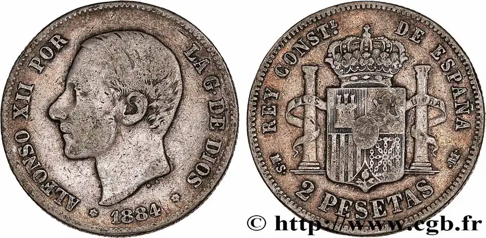 Type : 2 Pesetas Alphonse XIIDate : 1882Nom de l’atelier/ville : MadridQuantité frappée : 20343000Métal : argentTitre en millième : 835 ‰Diamètre : 27 mmAxe des coins : 6 h.Poids : 9,71 g.Tranche : canneléeRéférence ouvrage :KM.19/678 – Cy17500 – Cal.32 AversTitulature avers : ALFONSO XII POR – LA G. DE DIOS / * 1882 *.Description avers : portrait à gauche du roi Alphonse XII.ReversTitulature revers : REY CONSTL. DE ESPAÑA / M.S. 2 PESETAS .M..Description revers : écu couronné écartelé de Castille, de Léon, d’Aragon, de Navarre, enté en pointe de Grenade ; sur-le-tout de Bourbon-Anjou, entre les colonnes d’Hercule.HistoriqueESPAGNE
