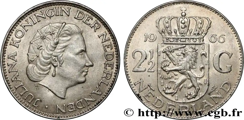Type : 2 1/2 Gulden JulianaDate : 1964Nom de l’atelier/ville : UtrechtQuantité frappée : 2800000Métal : argentTitre en millième : 720 ‰Diamètre : 33 mmAxe des coins : 6 h.Poids : 14,94 g.Tranche : en creuxRéférence ouvrage :KM20/185 AversTitulature avers : JULIANA KONINGIN DER NERDERLANDEN.Description avers : Tête nue à droite.Traduction avers : (Juliana reine des Pays Bas).ReversTitulature revers : NEDERLAND (DATE).Description revers : Écu aux armes du Royaume couronné, accosté de 2 1/2 – G, d’un poisson et d’un caducée.Traduction revers : (Pays Bas).HistoriquePAYS-BAS