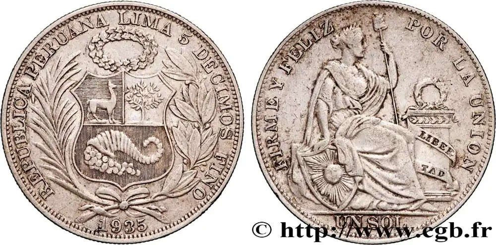 Type : 1 Sol “Liberté” assiseDate : 1865Nom de l’atelier/ville : LimaMétal : argentTitre en millième : 900 ‰Diamètre : 37 mmAxe des coins : 6 h.Poids : 24,74 g.Tranche : canneléeCommentaires sur l’état de conservation :Monnaie nettoyéeRéférence ouvrage :KM.19/196.1 AversTitulature avers : REPUBLICA PERUANA LIMA 5 DECIMOS FINO Y.B // 1865 .Description avers : Écu festonné entouré de drapeaux, surmonté d’une couronne, encadré d’une palme et d’une branche d’olivier.ReversTitulature revers : FIRME Y FELIZ – POR LA UNION / UN SOL.Description revers : La Liberté trônant de profil, tenant de la main droite une pique surmontée d’un bonnet phrygien et une palme de la main gauche ; à ses pieds, un bouclier aux armes du Pérou ; à gauche, un bandeau attaché à la pique inscrit en creux LIBERTAD.HistoriquePÉROU
