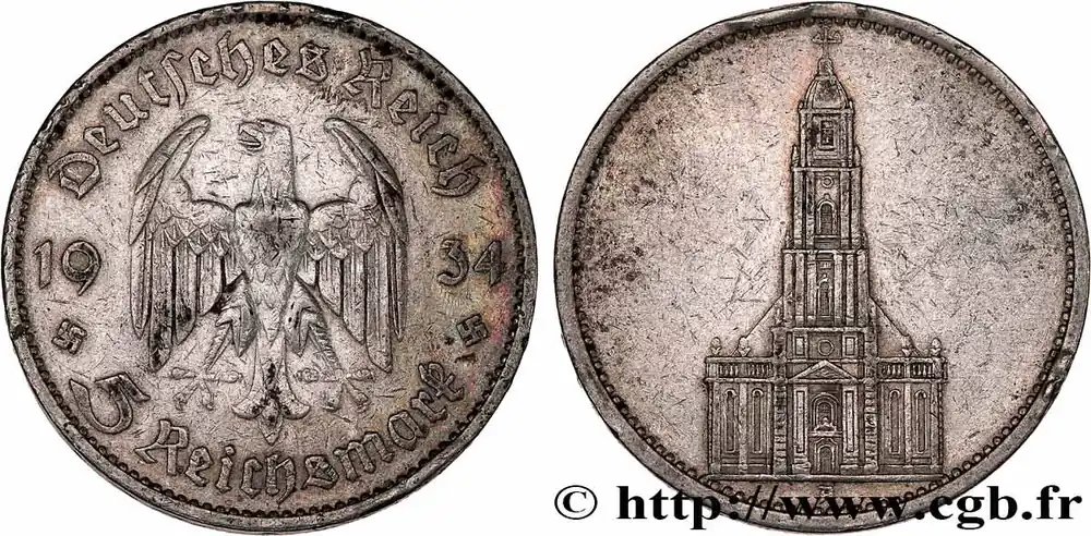 Type : 5 Reichsmark église de la garnison de PotsdamDate : 1935Nom de l’atelier/ville : MunichQuantité frappée : 3539395Métal : argentTitre en millième : 900 ‰Diamètre : 29 mmAxe des coins : 12 h.Poids : 13,88 g.Tranche : inscrite en creux GEMEINNUTZ GEHT VOR EIGENNUTZRéférence ouvrage :KM20/83 – AKS.26 AversTitulature avers : DEUTSCHES REICH / 19- 35 / REICHS / 5 / MARK.Description avers : aigle héraldique.ReversTitulature revers : D.Description revers : église de la garnison de Potsdam.CommentaireIMPORTANT : Cette monnaie est un objet de collection, témoin de l’histoire, il n’est en aucun cas l’expression d’une quelconque apologie du nazisme. Toute utilisation de cette monnaie en dehors du champ strict de la collection numismatique est interdite. L’acheteur s’engage à ne pas faire l’apologie du nazisme et la société de vente ne pourra être tenue responsable d’une toute autre utilisation par l’acheteur de la monnaie.HistoriqueALLEMAGNE