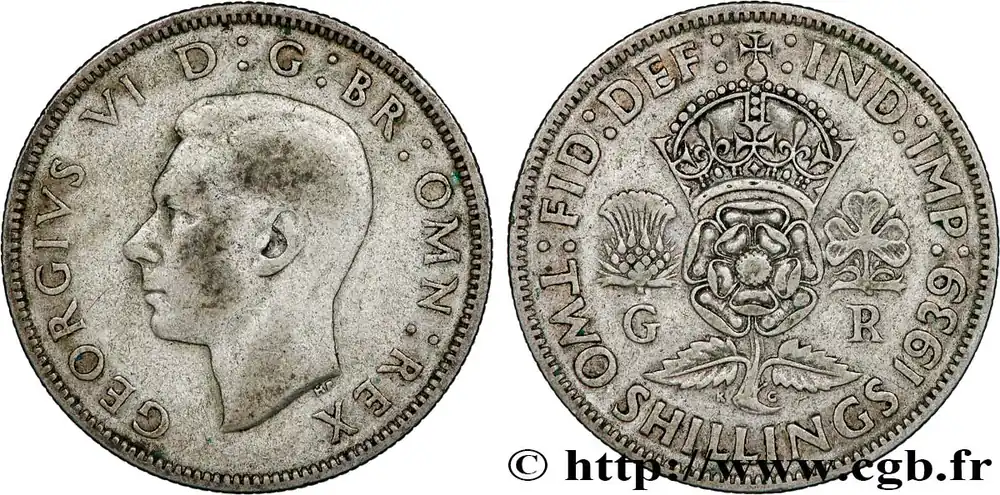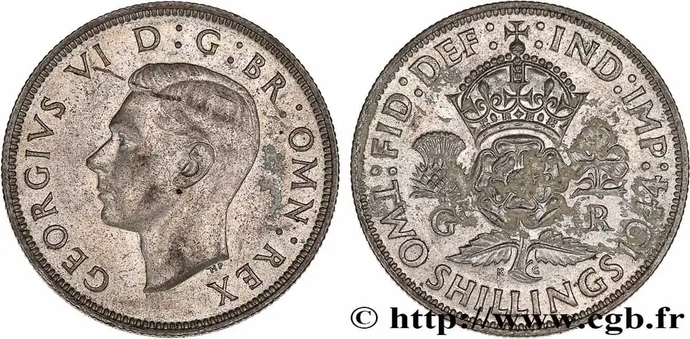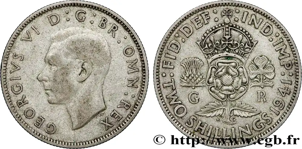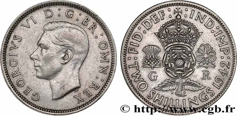 Type : 1 Florin (2 Shillings) Georges VIDate : 1942Quantité frappée : 39895000Métal : argentTitre en millième : 500 ‰Diamètre : 28,30 mmAxe des coins : 12 h.Poids : 11,29 g.Tranche : canneléeRéférence ouvrage :Sp.4081 – KM20/855 AversTitulature avers : GEORGIVS VI D : G / BR : OMN : REX.Description avers : portrait à gauche du roi Georges VI.ReversTitulature revers : :FID:DEF:-:IND:IMP: // TWO SHILLINGS 1942.Description revers : Rose couronnée, chardon à droite, trèfle à droite, initiales G-R.CommentaireEn 1937, la dénomination “Florin” est abandonnée pour l’équivalence “2 Shillings”.HistoriqueROYAUME-UNI