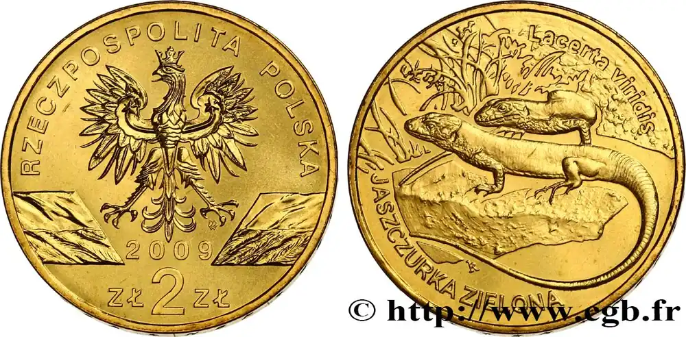 Type : 2 Zlote le lézard vert d’Europe (Lacerta viridis)Date : 2009Nom de l’atelier/ville : VarsovieQuantité frappée : 1700000Métal : cupro-aluminium ‘nordique’Diamètre : 27 mmAxe des coins : 12 h.Poids : 8,15 g.Tranche : inscrite en creux NBP ★ NBP ★ NBP ★ NBP ★ NBP ★ NBP ★ NBP ★ NBP ★ Référence ouvrage :KM21/678 AversTitulature avers : RZECZPOSPOLITA POLSKA // MW // 2009 / ZŁ 2 ZŁ .Description avers : emblème à l’aigle couronné entre deux drapeaux.Traduction avers : (République de Pologne // 2 Zlote).ReversTitulature revers : LACERTA VIRIDIS //JASZCZURKA ZIELONA .Description revers : deux lézards sur une pierre.HistoriquePOLOGNE