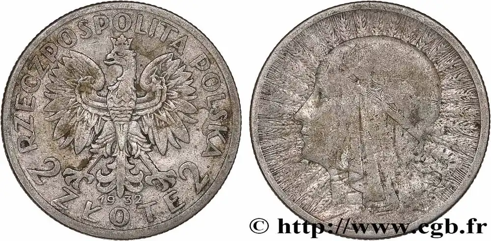 Type : 2 Zlote reine JadwigaDate : 1933Nom de l’atelier/ville : VarsovieQuantité frappée : 9250000Métal : argentTitre en millième : 750 ‰Diamètre : 22 mmAxe des coins : 12 h.Poids : 4,35 g.Tranche : canneléeCommentaires sur l’état de conservation :Traces de nettoyageRéférence ouvrage :KM20/20 AversTitulature avers : RZECZPOSPOLITA POLSKA // 2 ZŁOTE 2 // 19-33.Description avers : aigle héraldique.Traduction avers : (République Polonaise).ReversDescription revers : portrait à gauche de la reine Jadwiga.HistoriquePOLOGNE