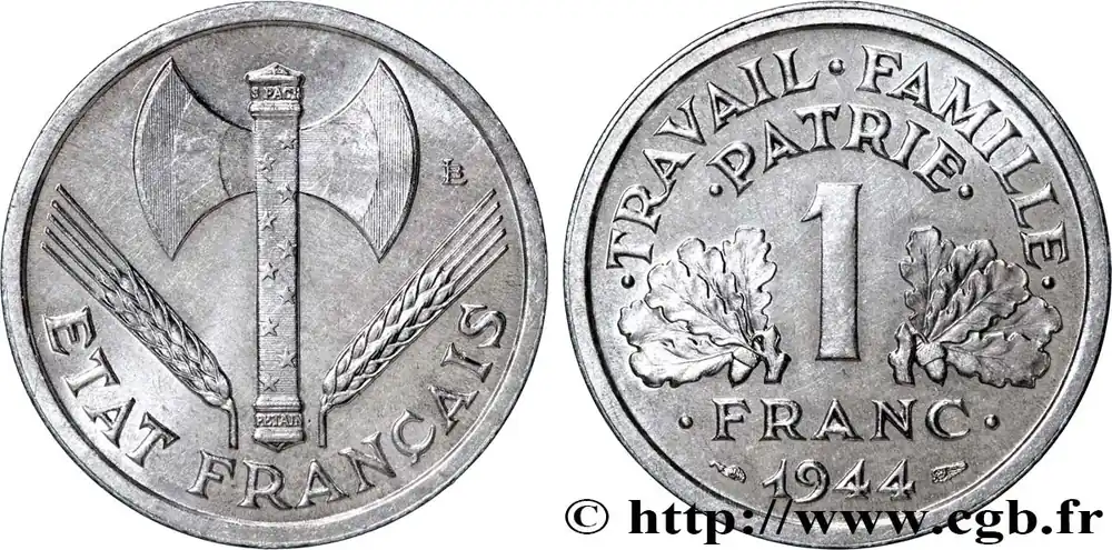 Type : 1 franc Francisque, légèreDate : 1944Quantité frappée : 73.213.850Métal : aluminiumDiamètre : 23 mmAxe des coins : 6 h.Poids : 1,31 g.Tranche : lisseRéférence ouvrage :Classement FRANC 2023 / FRANC 2023 classificationF.223/5AversTitulature avers : ETAT FRANÇAIS.Description avers : accostée de deux épis de blé, une francisque dont le manche est constitué par un bâton de maréchal orné de vingt-et-une étoiles dont dix étoiles à cinq rais visibles, portant en haut S. PACIS et en bas PETAIN, et les fers de trois bandes en drapeau français ; à droite de la francisque le monogramme LB pour Lucien Bazor.ReversTitulature revers : .TRAVAIL . FAMILLE. / .PATRIE..Description revers : 1 / .FRANC. au-dessus du millésime encadré des différents, accosté de deux rameaux de chêne, chacun étant composé de cinq feuilles et d’un gland.HistoriqueÉTAT FRANÇAIS(10/07/1940-26/08/1944) Né de l’effondrement de la Troisième République consécutif à la défaite française de mai-juin 1940, l’État français est fondé par un vote du Parlement réuni en Assemblée nationale à Vichy le 10 juillet 1940. L’Assemblée nationale par 569 oui, 80 non et 17 abstentions donne « tous pouvoirs au gouvernement de la République, sous l’autorité et la signature du maréchal Pétain, à l’effet de promulguer par un ou plusieurs actes une nouvelle constitution de l’État français ». Cette constitution doit « garantir les droits du Travail, de la Famille et de la Patrie ». Par six actes de 1940, la présidence de la République est supprimée au profit du maréchal Pétain, chef de l’État français. Une cour suprême de justice est créée. Le maréchal Pétain exerce un plein pouvoir non seulement gouvernemental mais aussi législatif puisqu’il nomme et révoque les ministres, et, il nomme à tous les emplois civils ou militaires. Il dispose aussi de la justice et de la force armée. Il négocie et ratifie les traités. À partir de 1941, tous les fonctionnaires doivent prêter serment au chef de l’État. Une réforme morale et intellectuelle s’attaque au divorce, à l’avortement, à l’alcoolisme, interdit la franc-maçonnerie et crée un commissariat aux Affaires Juives. Les syndicats sont supprimés et remplacés par un système corporatif. La famille est soutenue et la retraite des travailleurs est instituée. L’entrevue de Montoire du 24 octobre 1940 engage la France dans la voie de la collaboration qui devient totale dès juin 1941 avec les attentats de la résistance communiste. L’État français s’engage aussi aux côtés de l’Allemagne dans une croisade anti-bolchevique. Après la perte progressive de l’Empire, la zone sud est occupée par les Allemands provoquant le sabordage de la flotte à Toulon. Avec l’instauration du Service du Travail Obligatoire (S.T.O.), la résistance voit ses rangs augmenter. Les attentats, et leur répression, augmentent tandis que se forme le Conseil national de la Résistance. Le débarquement et les soulèvements de la résistance permettent au Gouvernement provisoire de la République française d’accroître son contrôle. Le 20 août 1944, le maréchal Pétain est emmené à Sigmaringen par les Allemands. Le 25, la division Leclerc est la première à entrer dans Paris en état d’insurrection, sonnant ainsi le glas du régime de Vichy.