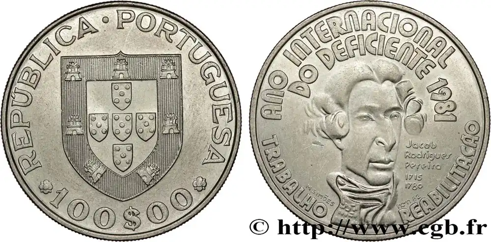 Type : 100 Escudos année internationale des handicapésDate : 1981Quantité frappée : 990000Métal : cupro-nickelDiamètre : 34 mmAxe des coins : 6 h.Poids : 16,50 g.Tranche : canneléeRéférence ouvrage :KM20/625 AversTitulature avers : REPUBLICA·PORTUGUESA / * 100$00 *.Description avers : armes du Portugal.ReversTitulature revers : ANO INTERNATIONAL DO DEFICIENTE 1981 / TRABALHO REABILITACÃO // JACOB / RODRIGUES / PEREIRA / 1715 / 1780 / M. SIMÕES INCM82.Description revers : portraitde Jacob Rodrigues Pereira.CommentaireJacob Rodrigues Pereira (Pereire) (1715-1780) est en France un des précurseurs de l’éducation des sourds et de l’orthophonie.HistoriquePORTUGAL
