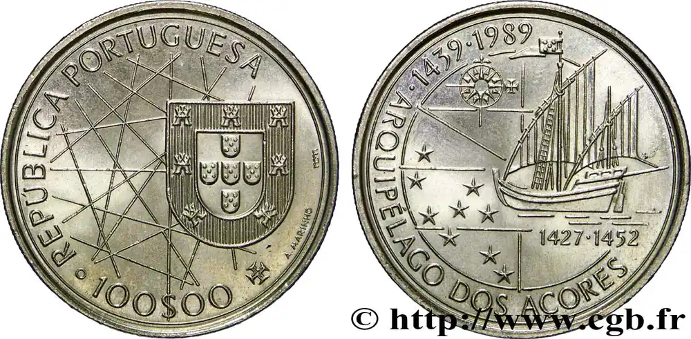 Type : 100 Escudos découverte des AçoresDate : 1989Quantité frappée : 2000000Métal : cupro-nickelDiamètre : 34 mmAxe des coins : 6 h.Tranche : striéeRéférence ouvrage :KM20/648  – Gom.81.01 AversTitulature avers : REPUBLICA PORTUGUESA // ·100$00.Description avers : écu du Portugal sur fond de lignes géométriques.ReversTitulature revers : •1439•1989 // ARQUIPÉLAGO DOS AÇORES // 1427•1452.Description revers : étoiles représentant chacune une île, rose des vents et navire à voiles latines.CommentaireLes îles composantes de l’archipel des Açores sont découvertes de 1427 (Santa Maria) à 1452 (Corvo et Flores). La colonisation est autorisée en 1439 par Henri le Navigateur.HistoriquePORTUGAL