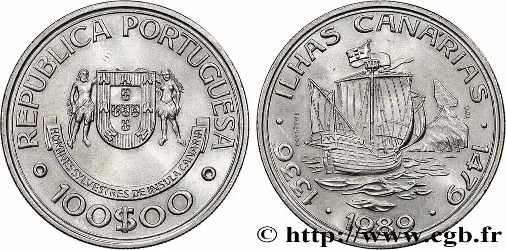 Type : 100 Escudos découverte des îles CanariesDate : 1989Quantité frappée : 2000000Métal : cupro-nickelDiamètre : 34 mmAxe des coins : 6 h.Poids : 16,60 g.Tranche : striéeRéférence ouvrage :KM20/646 – Gom.79.01 AversTitulature avers : REPÚBLICA PORTUGUESA // 100$00.Description avers : écu du Portugal entre deux guanches, devise “HOMINES SYLVESTRES DE INSULA CANARIA”.ReversTitulature revers : 1336 • ILHAS CANARIAS • 1479 // S. MACHADO – INCM // 1989.Description revers : voilier et une des îles de l’archipel des Canaries.CommentaireLa possession de l’archipel des Canaries est longtemps contestée entre le Portugal et la Castille jusqu’en 1479, à la signature du traité de Alcáçovas qui l’attribue définitivement à l’Espagne.HistoriquePORTUGAL