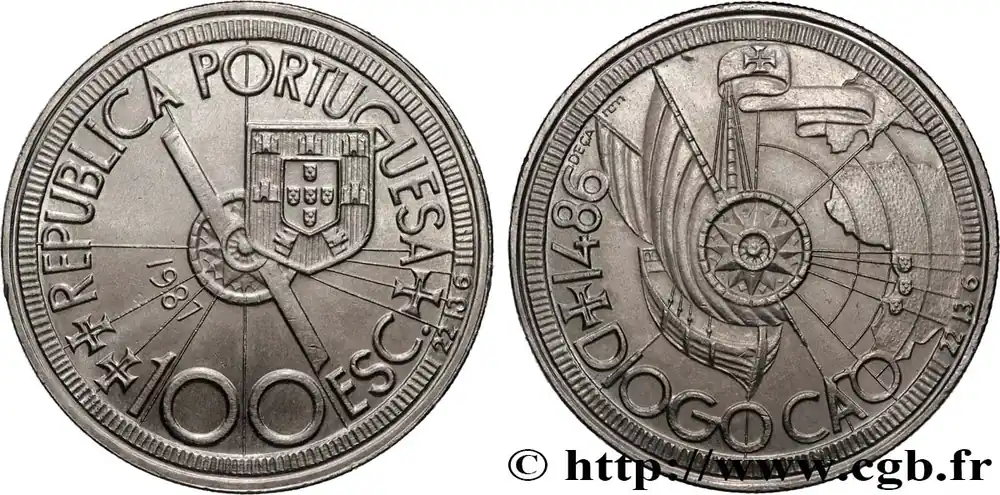 Type : 100 Escudos Diogo Cao et l’exploration des côtes africaines en 1486Date : 1987Quantité frappée : 1000000Métal : cupro-nickelDiamètre : 34 mmAxe des coins : 6 h.Poids : 16,5 g.Tranche : striéeRéférence ouvrage :KM20/641  – Gom.77.01 AversTitulature avers : REPUBLICA PORTUGUESA / ++100 ESC.+.Description avers : boussole, écu du Portugal et date “1987”.ReversTitulature revers : 1486 / +DIOGO CAO.Description revers : à gauche voilier, au centre boussole à droite carte des côtes occidentales de l’Afrique.CommentaireDiogo Cão (1450-1486) est un navigateur et explorateur portugais. Il fit deux voyages le long des côtes africaines jusqu’à l’actuelle Namibie et remonta le fleuve Congo jusqu’aux rapides de Matadi.HistoriquePORTUGAL