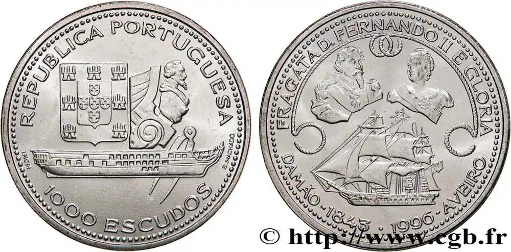 Type : 1000 Escudos frégate Fernando II e Gloria Date : 1996Quantité frappée : 600000Métal : argentTitre en millième : 500 ‰Diamètre : 40 mmAxe des coins : 6 h.Poids : 28 g.Tranche : striéeRéférence ouvrage :KM20/688  – Gom.158.01 AversTitulature avers : REPUBLICA PORTUGUESA // 1000 ESCUDOS.Description avers : frégate Fernando II e Gloria, détail de la proue et écu.ReversTitulature revers : FRAGATA FERNANDO II E GLORIA // DAMAO-1843 . 1996-AVEIRO.Description revers : Ferdinan II et Marie II, frégate Fernando II e Gloria .HistoriquePORTUGAL