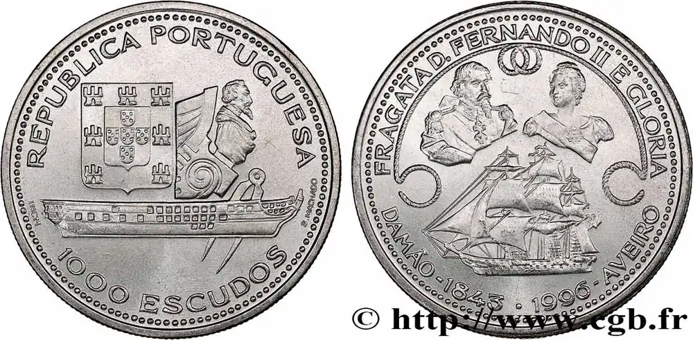 Type : 1000 Escudos frégate Fernando II e Gloria Date : 1996Quantité frappée : 600000Métal : argentTitre en millième : 500 ‰Diamètre : 40 mmAxe des coins : 6 h.Poids : 28 g.Tranche : striéeRéférence ouvrage :KM20/688  – Gom.158.01 AversTitulature avers : REPUBLICA PORTUGUESA // 1000 ESCUDOS.Description avers : frégate Fernando II e Gloria, détail de la proue et écu.ReversTitulature revers : FRAGATA FERNANDO II E GLORIA // DAMAO-1843 . 1996-AVEIRO.Description revers : Ferdinan II et Marie II, frégate Fernando II e Gloria .HistoriquePORTUGAL