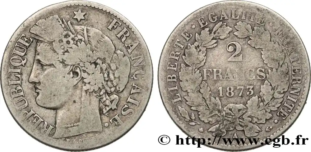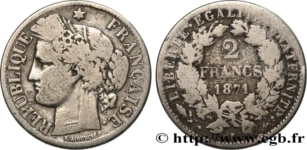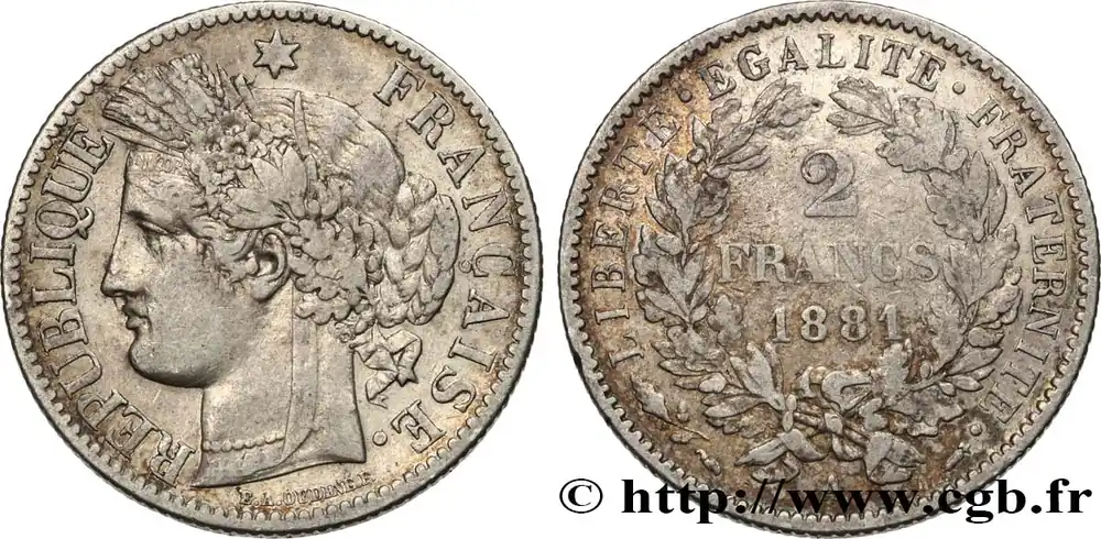 Type : 2 francs Cérès, avec légendeDate : 1887Nom de l’atelier/ville : ParisQuantité frappée : 2.342.903Métal : argentTitre en millième : 835 ‰Diamètre : 27 mmAxe des coins : 6 h.Poids : 9,86 g.Tranche : canneléeRéférence ouvrage :Classement FRANC 2023 / FRANC 2023 classificationF.265/13AversTitulature avers : REPUBLIQUE * FRANÇAISE..Description avers : Tête de la République à gauche en Cérès, déesse des moissons, portant un collier de perles, un double chignon et une couronne composite de blé, fleurs, olivier et olives, chêne et glands, nouée par un ruban descendant sur le cou et passant sur le front où est inscrit le mot CONCOR ; sous la tranche du cou le long du listel E. A. OUDINÉ. F..ReversTitulature revers : (DIFFÉRENT) (BRANCHE DE CHÊNE) LIBERTE . EGALITE . FRATERNITE. (DIFFÉRENT).Description revers : 2 / FRANCS, en deux lignes dans le champ, au-dessus du millésime, dans une couronne composite de deux branches de chêne et de deux de laurier, nouées deux par deux en bas par un ruban ; sous le nœud, la lettre d’atelier.HistoriqueTROISIÈME RÉPUBLIQUE(4/09/1870-10/07/1940) La nouvelle de la capitulation de Sedan provoque la révolution du 4 septembre 1870 à Paris. Proclamée à l’Hôtel de Ville, la République est dotée d’un gouvernement provisoire appelé gouvernement de la Défense nationale. Menacé à gauche par l’insurrection de la Commune et à droite par les monarchistes, le nouveau régime connaît des débuts difficiles. Chef du pouvoir exécutif dans un premier temps (février 1871), Thiers est chargé de réorganiser le pays avant de choisir sa forme de gouvernement. Il devient président de la République en août 1871 et, malgré son action de libération du territoire, doit quitter son poste en mars 1873 face à l’opposition royaliste. Il est alors remplacé par Mac-Mahon favorable au rétablissement de la monarchie mais celle-ci n’est pas restaurée à la suite de la question du drapeau. La loi du septennat est alors mise en place en novembre 1873 puis, en 1875, sont votées les lois fondamentales qui servent de Constitution à la Troisième République. Régime parlementaire, elle se caractérise notamment par la nette prépondérance du pouvoir législatif sur le pouvoir exécutif. Anticléricale, la Troisième République rend l’école gratuite, laïque et obligatoire mais continue la politique coloniale pour ses ambitions économiques, stratégiques et morales. La séparation des Églises et de l’État est votée en 1905. L’idée d’une revanche sur l’Allemagne et un nationalisme important sont au cœur de la crise boulangiste, du scandale de Panama ou de l’affaire Dreyfus des années 1886-1899 tandis que la politique étrangère est très active notamment au Maroc et que la course aux armements se développe. La Première Guerre mondiale coûte cher à la France qui ne se relève qu’à partir de 1920 voire 1928 pour la monnaie avec le franc « Poincaré ». La crise de 1929 ne se fait sentir qu’à partir de 1932 mais dure jusqu’en 1939, période durant laquelle l’instabilité ministérielle est très importante. Vacillant en 1934, la Troisième République trouve un nouveau ciment unitaire avec l’antifascisme qui permet l’arrivée au pouvoir du Front populaire en 1936. Mais, paralysée face à l’Allemagne, la France va alors s’enliser dans une « drôle de guerre » puis connaître l’une des plus grandes défaites de son histoire en juin 1940. Réunies en Assemblée nationale à Vichy le 10 juillet 1940, les Chambres, pourtant élues en 1936, votent les pleins pouvoirs à Pétain dans une sorte de suicide collectif par 569 voix pour, 80 voix contre et 18 abstentions.