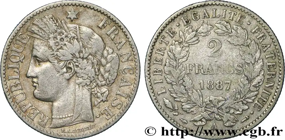 Type : 2 francs Cérès, avec légendeDate : 1887Nom de l’atelier/ville : ParisQuantité frappée : 2.342.903Métal : argentTitre en millième : 835 ‰Diamètre : 27 mmAxe des coins : 6 h.Poids : 9,86 g.Tranche : canneléeRéférence ouvrage :Classement FRANC 2023 / FRANC 2023 classificationF.265/13AversTitulature avers : REPUBLIQUE * FRANÇAISE..Description avers : Tête de la République à gauche en Cérès, déesse des moissons, portant un collier de perles, un double chignon et une couronne composite de blé, fleurs, olivier et olives, chêne et glands, nouée par un ruban descendant sur le cou et passant sur le front où est inscrit le mot CONCOR ; sous la tranche du cou le long du listel E. A. OUDINÉ. F..ReversTitulature revers : (DIFFÉRENT) (BRANCHE DE CHÊNE) LIBERTE . EGALITE . FRATERNITE. (DIFFÉRENT).Description revers : 2 / FRANCS, en deux lignes dans le champ, au-dessus du millésime, dans une couronne composite de deux branches de chêne et de deux de laurier, nouées deux par deux en bas par un ruban ; sous le nœud, la lettre d’atelier.HistoriqueTROISIÈME RÉPUBLIQUE(4/09/1870-10/07/1940) La nouvelle de la capitulation de Sedan provoque la révolution du 4 septembre 1870 à Paris. Proclamée à l’Hôtel de Ville, la République est dotée d’un gouvernement provisoire appelé gouvernement de la Défense nationale. Menacé à gauche par l’insurrection de la Commune et à droite par les monarchistes, le nouveau régime connaît des débuts difficiles. Chef du pouvoir exécutif dans un premier temps (février 1871), Thiers est chargé de réorganiser le pays avant de choisir sa forme de gouvernement. Il devient président de la République en août 1871 et, malgré son action de libération du territoire, doit quitter son poste en mars 1873 face à l’opposition royaliste. Il est alors remplacé par Mac-Mahon favorable au rétablissement de la monarchie mais celle-ci n’est pas restaurée à la suite de la question du drapeau. La loi du septennat est alors mise en place en novembre 1873 puis, en 1875, sont votées les lois fondamentales qui servent de Constitution à la Troisième République. Régime parlementaire, elle se caractérise notamment par la nette prépondérance du pouvoir législatif sur le pouvoir exécutif. Anticléricale, la Troisième République rend l’école gratuite, laïque et obligatoire mais continue la politique coloniale pour ses ambitions économiques, stratégiques et morales. La séparation des Églises et de l’État est votée en 1905. L’idée d’une revanche sur l’Allemagne et un nationalisme important sont au cœur de la crise boulangiste, du scandale de Panama ou de l’affaire Dreyfus des années 1886-1899 tandis que la politique étrangère est très active notamment au Maroc et que la course aux armements se développe. La Première Guerre mondiale coûte cher à la France qui ne se relève qu’à partir de 1920 voire 1928 pour la monnaie avec le franc « Poincaré ». La crise de 1929 ne se fait sentir qu’à partir de 1932 mais dure jusqu’en 1939, période durant laquelle l’instabilité ministérielle est très importante. Vacillant en 1934, la Troisième République trouve un nouveau ciment unitaire avec l’antifascisme qui permet l’arrivée au pouvoir du Front populaire en 1936. Mais, paralysée face à l’Allemagne, la France va alors s’enliser dans une « drôle de guerre » puis connaître l’une des plus grandes défaites de son histoire en juin 1940. Réunies en Assemblée nationale à Vichy le 10 juillet 1940, les Chambres, pourtant élues en 1936, votent les pleins pouvoirs à Pétain dans une sorte de suicide collectif par 569 voix pour, 80 voix contre et 18 abstentions.