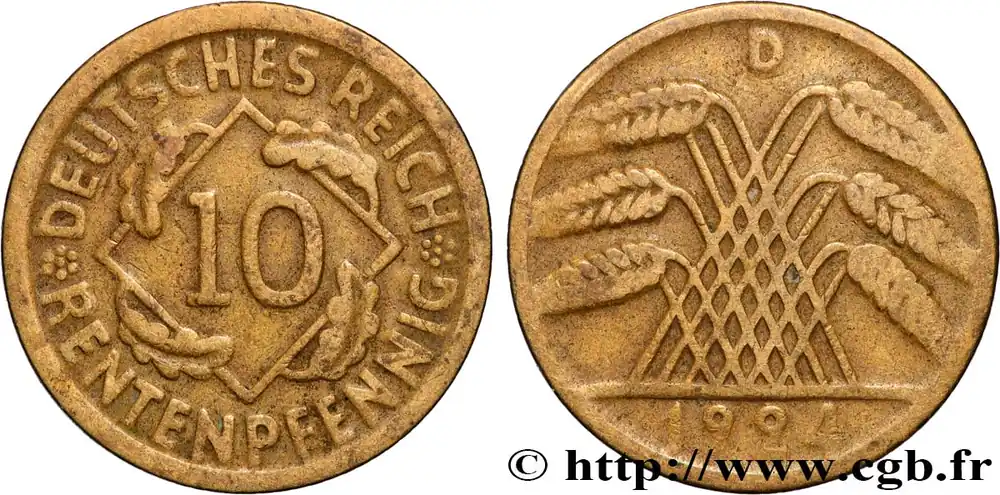 Type : 10 Rentenpfennig gerbe de bléDate : 1924Nom de l’atelier/ville : BerlinQuantité frappée : 169956017Métal : cuivreDiamètre : 21 mmAxe des coins : 12 h.Poids : 393 g.Tranche : lisseRéférence ouvrage :AKS.44 – KM20/33 AversDescription avers : chiffre dix dans un losange entouré de quatre feuilles de chêne.ReversTitulature revers : A // 1924.Description revers : épis de blé croisés.CommentaireLe Rentenmark (divisé en 100 Rentenpfennig) est introduit le 15 novembre 1923 afin de stopper l’hyperinflation des années 1922 et 1923. Le Rentenmark vaut 1000 milliards de “papiermark”. Son taux de change avec le dollar est fixé à 1 US$ = 4,2 RM. Le Rentenmark participera de manière efficace à l’arrêt de l’hyperinflation et sera peu à peu remplacé à partir de 1924 par le Reichsmark. Il sera échangeable jusqu’en 1948..HistoriqueALLEMAGNE