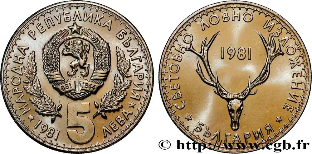 Type : 5 Leva exposition internationale de la chasseDate : 1981Nom de l’atelier/ville : SofiaQuantité frappée : 250000Métal : cupro-nickelDiamètre : 34 mmAxe des coins : 6 h.Poids : 16,40 g.Tranche : canneléeCommentaires sur l’état de conservation :sous capsuleRéférence ouvrage :KM20/131 AversTitulature avers : (LÉGENDE EN CYRILLIQUE) НАРОДНА РЕПУБЛИКА БЪЛГАРИА // 5 ЛЕВА.Description avers : Emblème de la République Populaire de Bulgarie.ReversTitulature revers : (LÉGENDE EN CYRILLIQUE) СВЕТОВНО ЛОВНО ИЗЛОЖЕНИЕ // 1981 // БЪЛГАРИА.Description revers : trophée de cerf.HistoriqueBULGARIE