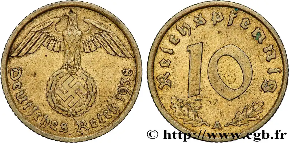 Type : 10 Reichspfennig aigle surmontant une swastikaDate : 1938Nom de l’atelier/ville : StuttgartQuantité frappée : 12306908Métal : cuivreDiamètre : 21 mmAxe des coins : 12 h.Poids : 4,00 g.Tranche : lisseCommentaires sur l’état de conservation :stries au reversRéférence ouvrage :AKS.46 AversTitulature avers : DEUTSCHES REICH 1938.Description avers : aigle surmontant une swastika.ReversTitulature revers : DEUTSCHES REICH / 1 / REICHSPFENNIG.Description revers : chiffre dix sur deux feuilles de chêne.CommentaireIMPORTANT : Cette monnaie est un objet de collection, témoin de l’histoire, il n’est en aucun cas l’expression d’une quelconque apologie du nazisme. Toute utilisation de cette monnaie en dehors du champ strict de la collection numismatique est interdite. L’acheteur s’engage à ne pas faire l’apologie du nazisme et la société de vente ne pourra être tenue responsable d’une toute autre utilisation par l’acheteur de la monnaie.HistoriqueALLEMAGNE