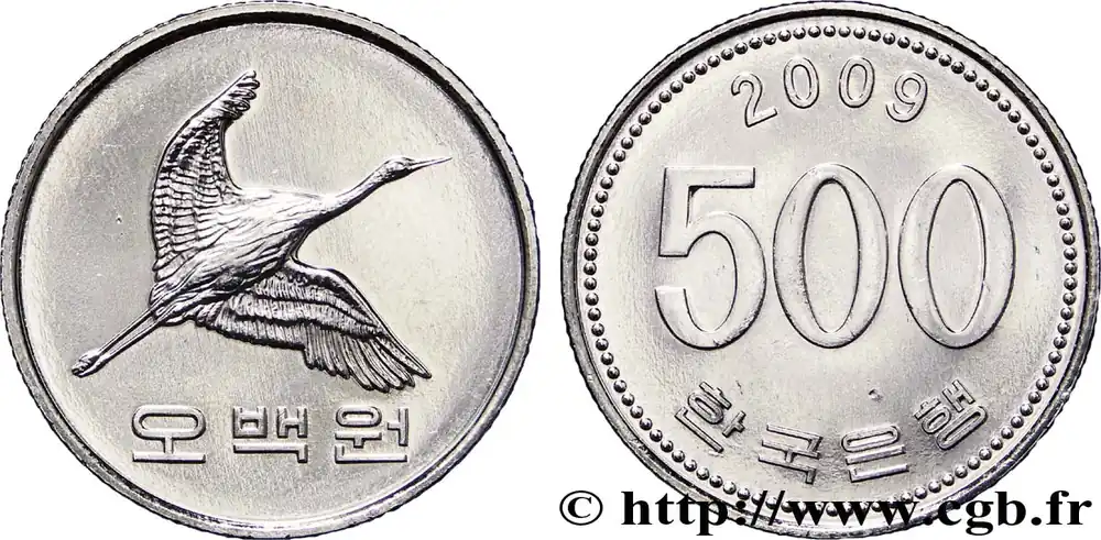 Type : 500 Won grue de MandchourieDate : 2009Quantité frappée : 40000000Métal : cupro-nickelDiamètre : 26,5 mmAxe des coins : 6 h.Poids : 7,70 g.Tranche : striéeRéférence ouvrage :KM21/27 AversTitulature avers : (LÉGENDE EN CORÉEN) 오백원.Description avers : Grue de Mandchourie.ReversTitulature revers : (LÉGENDE EN CORÉEN) 2009 / 500 / 한국은행.Description revers : Dans le champ.HistoriqueCORÉE DU SUD