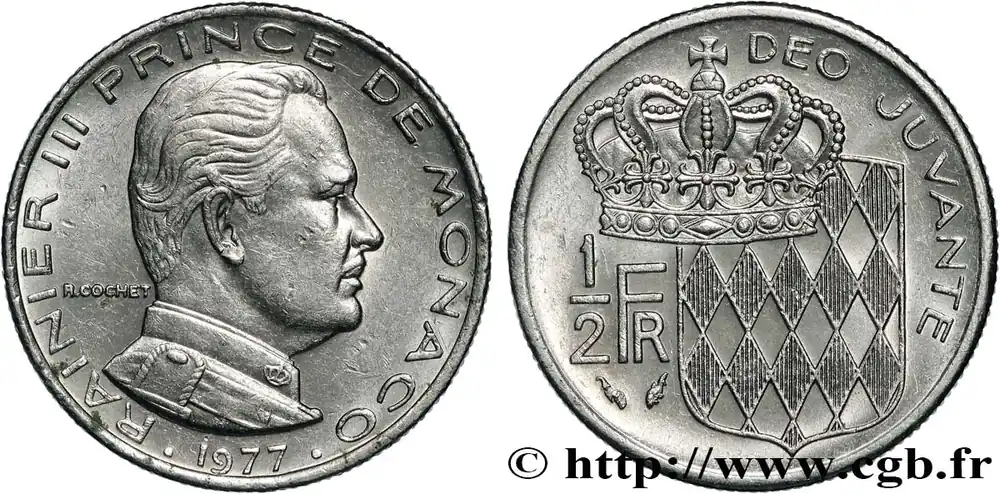 Type : 1/2 Franc Rainier IIIDate : 1968Nom de l’atelier/ville : ParisQuantité frappée : 125000Métal : nickelDiamètre : 19,5 mmAxe des coins : 6 h.Poids : 4,50 g.Tranche : striéeRéférence ouvrage :G.2019.149  – KM20/145 AversTitulature avers : RAINIER III PRINCE DE MONACO . (DATE) ..Description avers : Tête de Rainier III à droite.ReversTitulature revers : DEO JUVANTE / 1/2 FR.Description revers : Couronne princière devant le blason des Grimaldi.HistoriqueMONACO