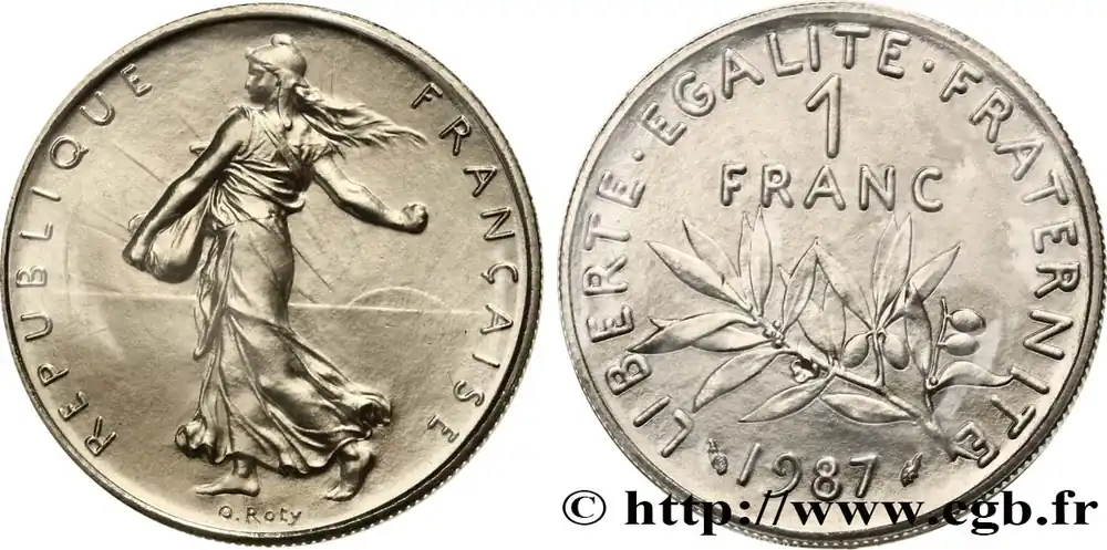 Type : 1 franc SemeuseDate : 1917Quantité frappée : 57.153.034Métal : argentTitre en millième : 835 ‰Diamètre : 23 mmAxe des coins : 6 h.Poids : 5,00 g.Tranche : canneléeCommentaires sur l’état de conservation :NettoyéRéférence ouvrage :Classement FRANC 2023 / FRANC 2023 classificationF.217/23AversTitulature avers : REPUBLIQUE FRANÇAISE.Description avers : La République à gauche, sous les traits d’une semeuse drapée et coiffée d’un bonnet phrygien, aux cheveux longs, marchant et semant à contre-vent ; en arrière-plan, derrière la semeuse à droite, un soleil levant ; au-dessous, en creux O. ROTY.ReversTitulature revers : LIBERTE . EGALITE . FRATERNITE.Description revers : 1 / FRANC, en deux lignes au-dessus d’une branche d’olivier tournée à gauche ; au-dessous, le millésime encadré des différents.HistoriqueTROISIÈME RÉPUBLIQUE(4/09/1870-10/07/1940) La nouvelle de la capitulation de Sedan provoque la révolution du 4 septembre 1870 à Paris. Proclamée à l’Hôtel de Ville, la République est dotée d’un gouvernement provisoire appelé gouvernement de la Défense nationale. Menacé à gauche par l’insurrection de la Commune et à droite par les monarchistes, le nouveau régime connaît des débuts difficiles. Chef du pouvoir exécutif dans un premier temps (février 1871), Thiers est chargé de réorganiser le pays avant de choisir sa forme de gouvernement. Il devient président de la République en août 1871 et, malgré son action de libération du territoire, doit quitter son poste en mars 1873 face à l’opposition royaliste. Il est alors remplacé par Mac-Mahon favorable au rétablissement de la monarchie mais celle-ci n’est pas restaurée à la suite de la question du drapeau. La loi du septennat est alors mise en place en novembre 1873 puis, en 1875, sont votées les lois fondamentales qui servent de Constitution à la Troisième République. Régime parlementaire, elle se caractérise notamment par la nette prépondérance du pouvoir législatif sur le pouvoir exécutif. Anticléricale, la Troisième République rend l’école gratuite, laïque et obligatoire mais continue la politique coloniale pour ses ambitions économiques, stratégiques et morales. La séparation des Églises et de l’État est votée en 1905. L’idée d’une revanche sur l’Allemagne et un nationalisme important sont au cœur de la crise boulangiste, du scandale de Panama ou de l’affaire Dreyfus des années 1886-1899 tandis que la politique étrangère est très active notamment au Maroc et que la course aux armements se développe. La Première Guerre mondiale coûte cher à la France qui ne se relève qu’à partir de 1920 voire 1928 pour la monnaie avec le franc « Poincaré ». La crise de 1929 ne se fait sentir qu’à partir de 1932 mais dure jusqu’en 1939, période durant laquelle l’instabilité ministérielle est très importante. Vacillant en 1934, la Troisième République trouve un nouveau ciment unitaire avec l’antifascisme qui permet l’arrivée au pouvoir du Front populaire en 1936. Mais, paralysée face à l’Allemagne, la France va alors s’enliser dans une « drôle de guerre » puis connaître l’une des plus grandes défaites de son histoire en juin 1940. Réunies en Assemblée nationale à Vichy le 10 juillet 1940, les Chambres, pourtant élues en 1936, votent les pleins pouvoirs à Pétain dans une sorte de suicide collectif par 569 voix pour, 80 voix contre et 18 abstentions.