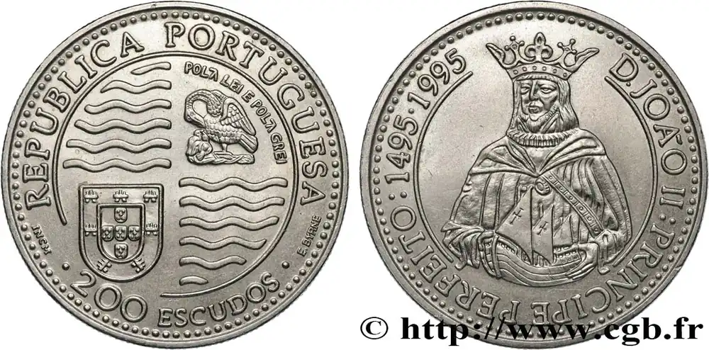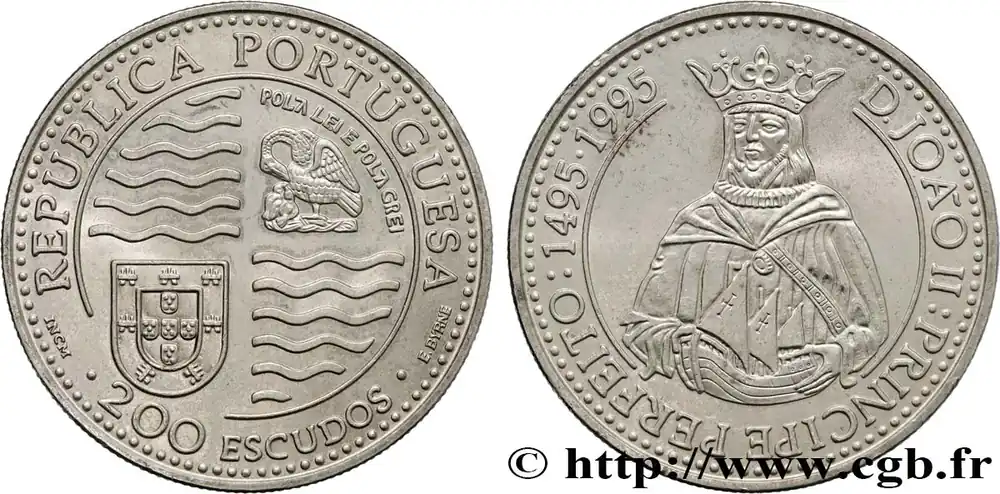 Type : 200 Escudos 500e anniversaire du règne de Jean IIDate : 1995Quantité frappée : 750000Métal : cupro-nickelDiamètre : 36 mmAxe des coins : 6 h.Poids : 21,18 g.Tranche : canneléeRéférence ouvrage :KM20/673  – Gom.113.01 AversTitulature avers : REPUBLICA PORTUGUESA // 200 ESCUDOS.Description avers : ondes, écu du Portugal, symbole du roi Jean II (pélican nourrissant ses petits avec devise ” POLÁ LEI E POLÁ GREI “).ReversTitulature revers : D. JOÁO II : PRINCIPE PERFEITO : 1495.1995.Description revers : portrait du roi Jean II tenant une maquette de voilier.HistoriquePORTUGAL
