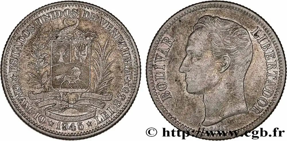 Type : 2 Bolivares Simon BolivarDate : 1929Nom de l’atelier/ville : PhiladelphieQuantité frappée : 1500000Métal : argentTitre en millième : 835 ‰Diamètre : 27 mmAxe des coins : 6 h.Poids : 9,55 g.Tranche : striéeRéférence ouvrage :KM20/23 AversTitulature avers : ESTADOS UNIDOS DE VENEZUELA // GRAM.10.1929. LEI 835.Description avers : emblème du Venezuela.Traduction avers : (États-Unis du Venezuela).ReversTitulature revers : BOLIVAR LIBERTADOR // BARRE.Description revers : portrait à gauche de Simon Bolivar.HistoriqueVENEZUELA