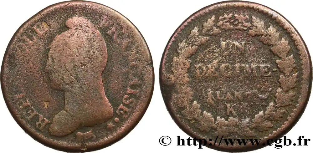 Type : Un décime à l’N couronnéeDate : .Date : 1814Nom de l’atelier/ville : StrasbourgQuantité frappée : —Métal : bronzeDiamètre : 32 mmAxe des coins : 6 h.Poids : 21,50 g.Tranche : irrégulièreDegré de rareté : R2Référence ouvrage :Classement FRANC 2023 / FRANC 2023 classificationF.131/4AversDescription avers : N au jambage perlé sous une couronne impériale ornée de deux rubans et portant un globe crucigère, le tout dans une couronne fermée composée de deux branches de chêne opposées nouées à leur base par un ruban.ReversTitulature revers : UN / DÉCIME.Description revers : suivi ou non d’un point, en deux lignes dans le champ au-dessus de 1814 suivi ou non d’un point, au-dessus de la lettre d’atelier, le tout dans dans une couronne fermée composée de deux branches de chêne opposées nouées à leur base par un ruban.CommentairePas de point après DÉCIME mais un point après 1814.HistoriquePREMIER EMPIRE(18/05/1804-6/04/1814) Renforcée par la conspiration de Cadoudal de mars 1804, l’idée du pouvoir héréditaire trouve son aboutissement le 18 mai 1804 lorsque Napoléon Bonaparte devient empereur des Français sous le nom de Napoléon Ier. Ratifié par plébiscite, l’Empire est consacré le 2 décembre 1804 lors du sacre de Notre-Dame. La Constitution de l’an XII étant toujours en vigueur, le Premier Empire semble fonctionner comme une continuation de la République française dirigée par un empereur. C’est en réalité une dictature personnelle où l’empereur nomme et révoque les ministres, a l’initiative des lois et contrôle le Corps législatif. Dans les départements, les préfets renseignent le ministère de l’Intérieur. Les postes, la presse, l’imprimerie sont contrôlées par la censure. Les grands corps de l’Etat sont réorganisés ainsi que la Justice avec le Code pénal qui complète le Code civil achevé sous le Consulat. Universités et écoles sont encadrées. En 1805, Napoléon devient roi d’Italie tandis que se forment des coalitions contre l’Empire. Malgré la défaite navale de Trafalgar, les armées impériales remportent de nombreuses victoires terrestres comme Austerlitz, Iéna ou Eylau qui assurent le contrôle de l’Europe continentale. Démembrée, celle-ci est attribuée à la famille Bonaparte qui semble triompher partout. Fortifiée par le blocus continental, l’industrie est prospère mais le commerce souffre. En 1808, le blocus continental est renforcé par un second décret pris à Milan en date du 17 décembre 1807. La guerre d’Espagne débute après que Junot ait conquis le Portugal qui refusait d’appliquer le blocus. Rapidement, les Madrilènes se soulèvent contre l’occupation française de Murat. Les 1er et 2 mai, les français répriment avec férocité des mouvements de guérilla. Des exécutions massives ont lieu. Elles sont immortalisées par Goya dans son célèbre Primer y Dos de Mayo. Joseph, roi de Naples, est nommé roi d’Espagne à contrecœur. Murat le remplace sur le trône de Naples avec sa femme Caroline. Malgré les abdications forcées de Charles IV et de Ferdinand VII à Bayonne, en présence de Napoléon, les Français assistent à un soulèvement général en Espagne et sont battus à Bailen le 22 juillet : ils perdent Madrid. Wellington et un corps expéditionnaire anglais débarquent au Portugal le 1er août. Junot doit capituler à Cintra le 30 août. Les Français reprennent Madrid le 4 décembre 1808. En avril 1809, Pie VII excommunie Napoléon qui le fait séquestrer en représailles. Les alliés forment la cinquième coalition, mais les Autrichiens sont battus à Eckmühl le 12 avril, Essling le 21 mai et Wagram le 6 juillet 1809. Au traité de Vienne, l’Autriche cède la Carniole, la Carinthie et la Croatie qui vont former les provinces illyriennes qui sont incorporées à l’Empire. La colonne Vendôme est inaugurée en 1810. Cette année là, Napoléon est au faîte de sa puissance et la France compte 130 départements du Tibre à l’Elbe. Après avoir divorcé d’avec Joséphine en décembre 1809, il épouse Marie-Louise d’Autriche le 2 avril 1810. Louis abdique du trône de Hollande, le 9 juillet 1810, refusant d’appliquer le Blocus Continental et le Royaume est annexé à la France. En 1811, l’Empereur, qui a fait dissoudre son mariage avec Joséphine, épouse l’archiduchesse Marie-Louise qui lui donne un fils, le roi de Rome qui naît aux Tuileries le 20 mars 1811. Les relations franco-russes se sont détériorées après le mariage autrichien. Finalement, Napoléon franchit le Niémen le 24 juin 1812. C’est le début de la campagne de Russie. À la tête de la Grande Armée, il prend Vilna (28 juin), remporte la victoire de Smolensk (18 août), puis la difficile bataille de la Moscova (5-7 septembre). Il prend Moscou entre le 15 et le 18 septembre. La ville est incendiée par les Russes et les Français doivent l’évacuer. La Grande Armée est obligée de faire retraite avec l’hiver russe qui commence très tôt et un ennemi qui pratique la politique de la terre brûlée. C’est la bataille de la Berezina le 27-29 novembre 1812. Sur 600.000 hommes, moins de 30.000 repassent la frontière russe. Le Général Malet tente un coup d’état à Paris le 23 octobre. Il est fusillé le 29. Les Russes occupent Varsovie, Hambourg et Dresde. Les Prussiens remportent les victoires de Lutzen et Bautzen les 2 et 21 mai 1813. Toute l’Europe se ligue contre Napoléon lors de la sixième coalition et il est battu à la bataille des Nations le 16-19 octobre 1813. La campagne de France commence en janvier 1814. Malgré les victoires de Montmirail et de Montereau les 10 et 18 février, Napoléon ne peut empêcher la capitulation de Paris le 31 mars. Il est contraint d’abdiquer le 6 avril 1814 et part sur l’île d’Elbe.
