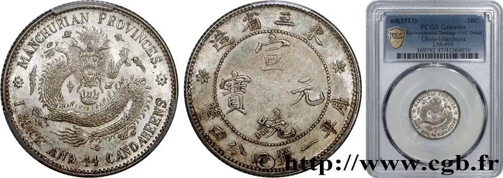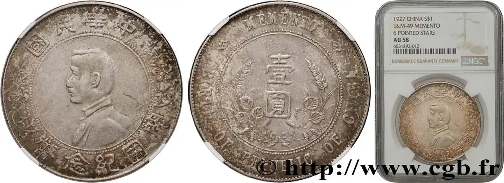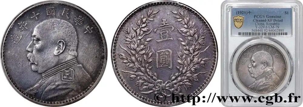 Type : 1 Dollar ou Yuan Sun Yat-Sen – Naissance de la RépubliqueDate : 1927Quantité frappée : -Métal : argentTitre en millième : 900 ‰Diamètre : 39 mmAxe des coins : 12 h.Poids : 26,73 g.Tranche : canneléeSlabPCGS : AUCommentaires sur l’état de conservation :Exemplaire sous coque PCGS Genuine Cleaned AU DetailRéférence ouvrage :KM20/318a.1 AversTitulature avers : (LÉGENDE CHINOISE).Description avers : Portrait de Sun Yat Sen à gauche dans un cercle perlé.ReversTitulature revers : MEMENTO BIRTH OF REPUBLIC.Description revers : Couronne de feuillage dans un cercle perlé.HistoriqueCHINE