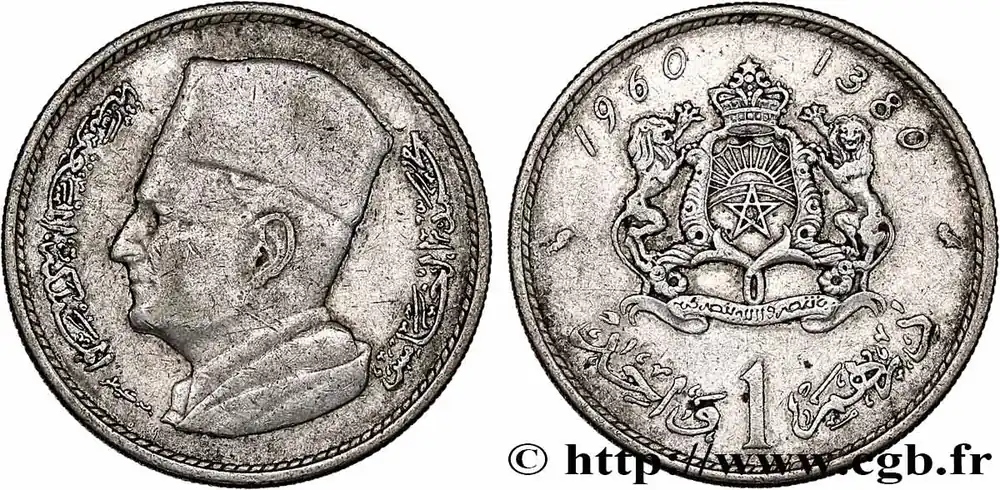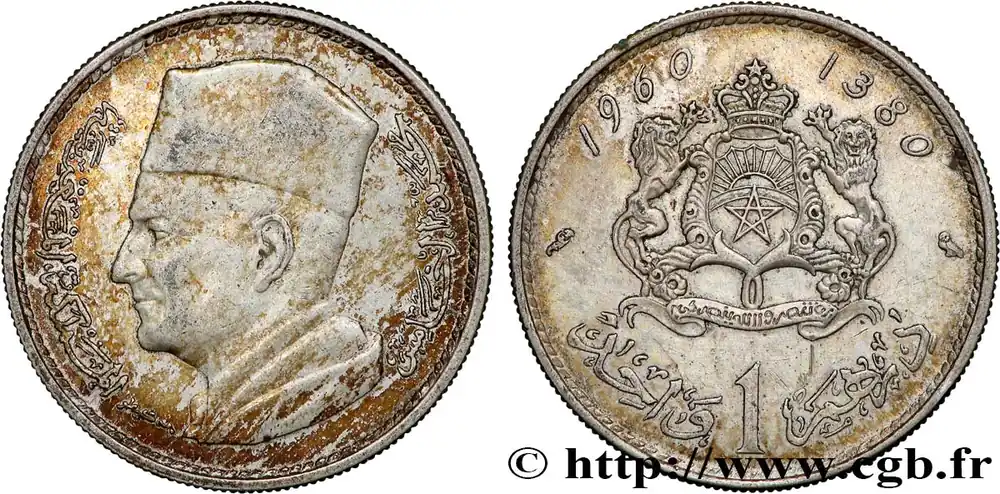 Type : 1 Dirham Mohammed V AH 1380Date : 1960Nom de l’atelier/ville : ParisQuantité frappée : 33000000Métal : argentTitre en millième : 600 ‰Diamètre : 24 mmAxe des coins : 6 h.Poids : 5,98 g.Tranche : canneléeRéférence ouvrage :KM20/55 AversTitulature avers : (LÉGENDE EN ARABE).Description avers : buste à gauche du roi Mohammed V.ReversTitulature revers : 1960 – 1380 (LÉGENDE EN ARABE).Description revers : armes du Royaume du Maroc.HistoriqueMAROC