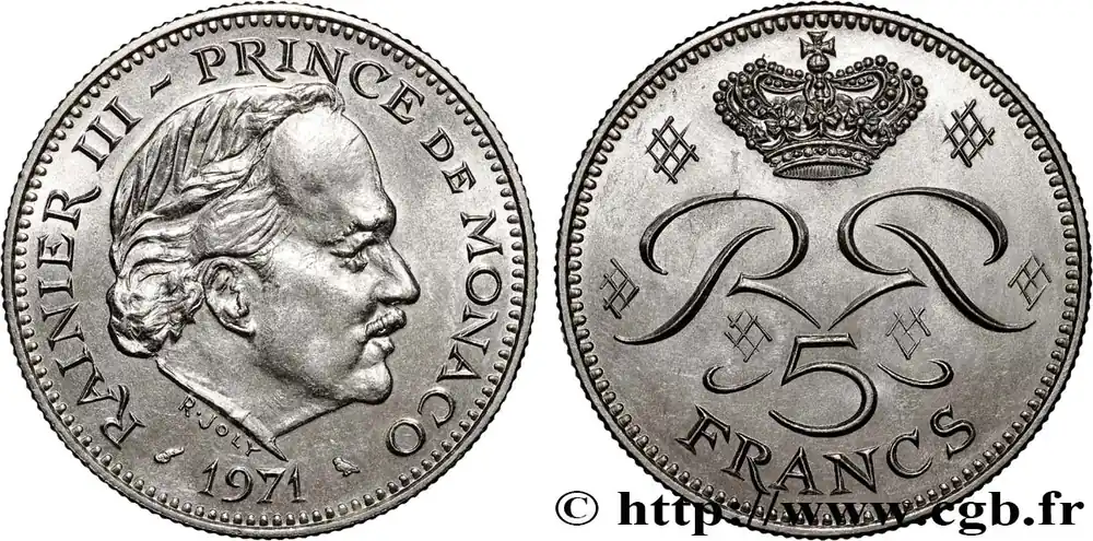 Type : 5 Francs Rainier IIIDate : 1971Nom de l’atelier/ville : ParisQuantité frappée : 250000Métal : cupro-nickelDiamètre : 29 mmAxe des coins : 6 h.Poids : 10,04 g.Tranche : striéeRéférence ouvrage :G.2019.153  – KM20/150 AversTitulature avers : RAINIER III PRINCE DE MONACO / 1971.Description avers : Tête de Rainier III à droite.ReversTitulature revers : 5 / FRANCS.Description revers : Deux R entrelacés et opposés sour une couronne princière.HistoriqueMONACO