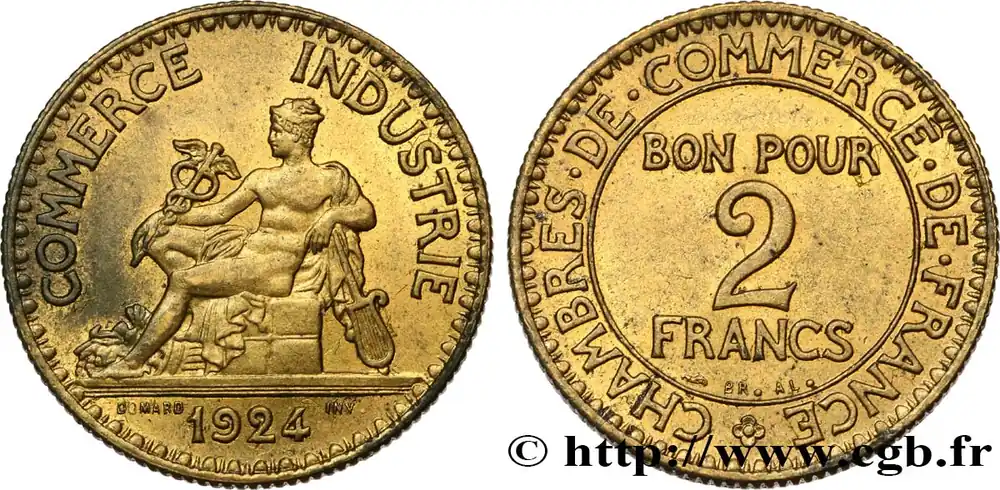Type : 2 francs Chambres de CommerceDate : 1926Quantité frappée : 2.962.351Métal : bronze-aluminiumDiamètre : 27 mmAxe des coins : 6 h.Poids : 7,84 g.Tranche : canneléeRéférence ouvrage :Classement FRANC 2023 / FRANC 2023 classificationF.267/8AversTitulature avers : COMMERCE INDUSTRIE.Description avers : Mercure assis à gauche sur un ballot de marchandise, légèrement drapé et coiffé du pétase ailé, la main gauche appuyée sur un gouvernail antique, la main droite tenant un caducée ; une corne d’abondance en arrière-plan du ballot ; sous un trait d’exergue, le millésime accosté de DOMARD / INV.ReversTitulature revers : (FLEUR) CHAMBRES . DE . COMMERCE . DE . FRANCE.Description revers : BON POUR / 2 / FRANCS, en trois lignes dans le champ ; au-dessous corne de la Régie des Monnaies et à droite BR. AL.HistoriqueTROISIÈME RÉPUBLIQUE(4/09/1870-10/07/1940) La nouvelle de la capitulation de Sedan provoque la révolution du 4 septembre 1870 à Paris. Proclamée à l’Hôtel de Ville, la République est dotée d’un gouvernement provisoire appelé gouvernement de la Défense nationale. Menacé à gauche par l’insurrection de la Commune et à droite par les monarchistes, le nouveau régime connaît des débuts difficiles. Chef du pouvoir exécutif dans un premier temps (février 1871), Thiers est chargé de réorganiser le pays avant de choisir sa forme de gouvernement. Il devient président de la République en août 1871 et, malgré son action de libération du territoire, doit quitter son poste en mars 1873 face à l’opposition royaliste. Il est alors remplacé par Mac-Mahon favorable au rétablissement de la monarchie mais celle-ci n’est pas restaurée à la suite de la question du drapeau. La loi du septennat est alors mise en place en novembre 1873 puis, en 1875, sont votées les lois fondamentales qui servent de Constitution à la Troisième République. Régime parlementaire, elle se caractérise notamment par la nette prépondérance du pouvoir législatif sur le pouvoir exécutif. Anticléricale, la Troisième République rend l’école gratuite, laïque et obligatoire mais continue la politique coloniale pour ses ambitions économiques, stratégiques et morales. La séparation des Églises et de l’État est votée en 1905. L’idée d’une revanche sur l’Allemagne et un nationalisme important sont au cœur de la crise boulangiste, du scandale de Panama ou de l’affaire Dreyfus des années 1886-1899 tandis que la politique étrangère est très active notamment au Maroc et que la course aux armements se développe. La Première Guerre mondiale coûte cher à la France qui ne se relève qu’à partir de 1920 voire 1928 pour la monnaie avec le franc « Poincaré ». La crise de 1929 ne se fait sentir qu’à partir de 1932 mais dure jusqu’en 1939, période durant laquelle l’instabilité ministérielle est très importante. Vacillant en 1934, la Troisième République trouve un nouveau ciment unitaire avec l’antifascisme qui permet l’arrivée au pouvoir du Front populaire en 1936. Mais, paralysée face à l’Allemagne, la France va alors s’enliser dans une « drôle de guerre » puis connaître l’une des plus grandes défaites de son histoire en juin 1940. Réunies en Assemblée nationale à Vichy le 10 juillet 1940, les Chambres, pourtant élues en 1936, votent les pleins pouvoirs à Pétain dans une sorte de suicide collectif par 569 voix pour, 80 voix contre et 18 abstentions.