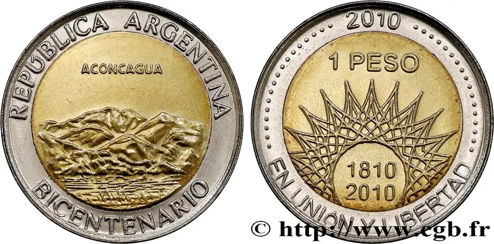 Type : 1 Peso bicentenaire de la Révolution de Mai : Aconcagua / symbole du BicentenaireDate : 2010Quantité frappée : 60000000Métal : bimétalliqueDiamètre : 22,94 mmAxe des coins : 12 h.Poids : 6,35 g.Tranche : lisseRéférence ouvrage :SCWC-21/157 AversTitulature avers : REPÚBLICA ARGENTINA // ACONCAGUA // BICENTENARIO.Description avers : vue du Mont Aconcagua.ReversTitulature revers : 2010 // 1 PESO // EN UNIÓN Y LIBERTAD.Description revers : Symbole du Bicentenaire avec les dates 1810 /2010.CommentaireEn 2010, l’Argentine commémore le bicentenaire de la Révolution de Mai qui aboutit en 1810 à destitution du vice-roi au profit d’une junte, premier gouvernement national.Le revers de cette monnaie illustre l’Aconcagua, point culminant de la cordillère des Andes (6 962 mètres )..HistoriqueARGENTINE