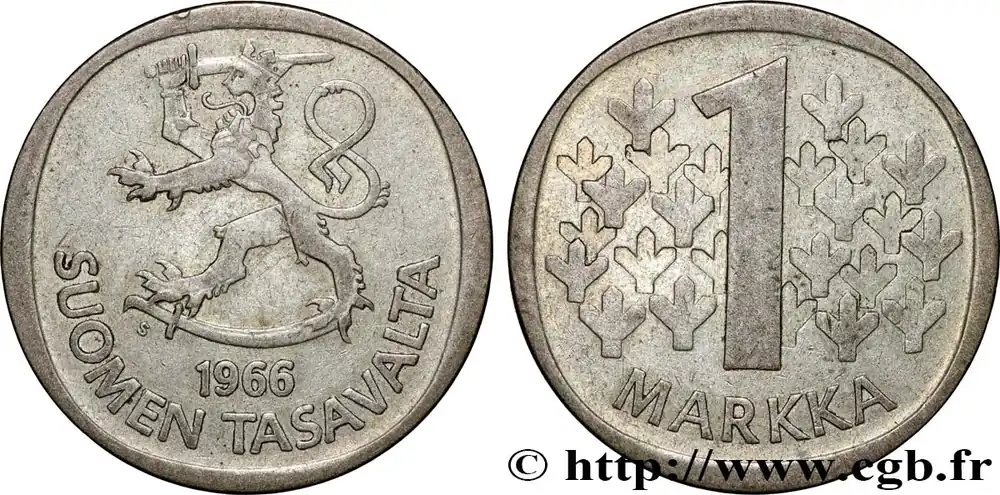 Type : 1 MarkkaDate : 1965Quantité frappée : 15107000Métal : argentTitre en millième : 340 ‰Diamètre : 24 mmAxe des coins : 12 h.Poids : 6,40 g.Tranche : inscrite en creux SUOMI FINLAND *** SUOMI FINLAND ***Référence ouvrage :KM20/49 AversTitulature avers : S // 1965 // SUOMEN TASAVALTA.Description avers : lion couronné brandissant une épée les pattes posées sur un sabre.ReversTitulature revers : 1 // MARKKA.Description revers : dans le champ, branche de conifères.HistoriqueFINLANDE