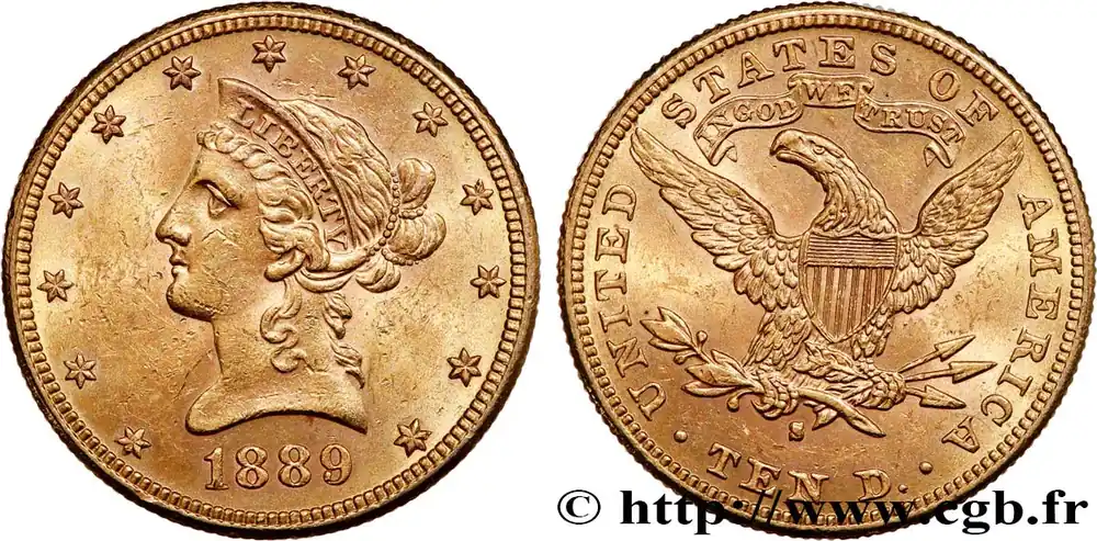 Type : 10 Dollars « Liberty »Date : 1893Nom de l’atelier/ville : PhiladelphieQuantité frappée : 1840895Métal : orTitre en millième : 900 ‰Diamètre : 27 mmAxe des coins : 6 h.Poids : 16,73 g.Tranche : canneléeCommentaires sur l’état de conservation :De petits coups dans les champs, traces de nettoyageRéférence ouvrage :KM.19/102  – Y.- AversTitulature avers : 1893.Description avers : Tête de la Liberté à gauche entourée de treize étoiles avec un bandeau inscrit LIBERTY.ReversTitulature revers : UNITED. STATES. OF. AMERICA/ TEN D./ – IN/ GOD/ WE/ TRUST.Description revers : Aigle debout à gauche sur un faisceau.Traduction revers : (États-Unis d’Amérique ; 10 dollars ; De plusieurs ils ne font qu’un ; en Dieu, nous faisons confiance).HistoriqueOR, PALLADIUM ET PLATINE INVESTISSEMENTSécurisez et diversifiez votre épargne avec les métaux précieux :Dans un contexte d’instabilité politique et économique croissante, diversifier son épargne peut être une démarche judicieuse. Les métaux précieux comme l’or, le palladium et le platine constituent des actifs tangibles souvent prisés en raison de leur caractère intemporel et de leur résilience face aux fluctuations des marchés.Pour répondre à des besoins variés, l’achat de pièces officielles en or, palladium ou platine est une option flexible et adaptée. Ces pièces, disponibles à l’unité ou en lot, permettent à chacun d’ajuster ses choix selon ses objectifs et son budget, sans engagement à long terme.Un processus simple et sécurisé :Nous proposons une livraison sécurisée et garantie. Les paiements peuvent être effectués par carte bancaire ou par virement, bien que certaines transactions puissent nécessiter un règlement exclusivement par virement bancaire. Une pièce d’identité valide (carte nationale d’identité ou passeport) sera demandée pour finaliser votre achat.Stockage en toute sécurité et confidentialité :Le département Investissement de CGB Numismatique Paris met à votre disposition des solutions de stockage offrant une sécurité renforcée et une confidentialité optimale pour vos achats en or, palladium et platine.Contactez-nous pour plus d’informations :Pour toute question ou pour passer commande, prenez contact avec notre responsable des achats/ventes de métaux précieux : par email à [email protected] ou par téléphone. Nous mettons à votre disposition des informations générales et des services pour vous accompagner dans vos projets d’investissement.CGB Numismatique Paris agit en tant que fournisseur de métaux précieux et ne fournit aucun conseil en investissement. La valeur des métaux précieux peut fluctuer, et les performances passées ne garantissent pas les résultats futurs. L’achat de métaux précieux doit être considéré comme une stratégie de préservation de valeur plutôt qu’un investissement spéculatif. Conformément à l’article L.221-28 du Code de la consommation, le droit de rétractation ne s’applique pas aux achats d’or d’investissement, dont le prix dépend des fluctuations des marchés financiers.