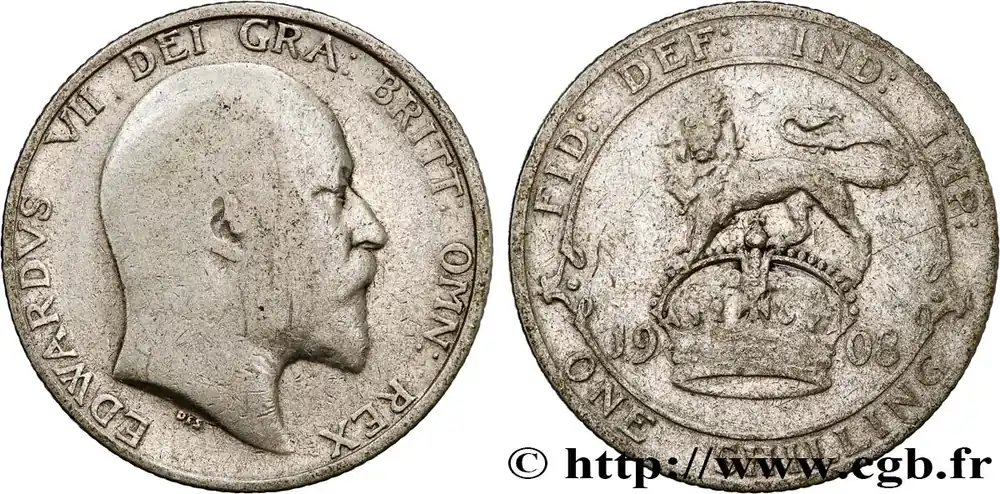 Type : 1 Shilling Edouard VIIDate : 1904Quantité frappée : 2040100Métal : argentTitre en millième : 925 ‰Diamètre : 18,5 mmAxe des coins : 12 h.Poids : 5,57 g.Tranche : canneléeRéférence ouvrage :Sp.3982 – KM20/800 AversTitulature avers : EDWARDVS VII DEI GRA BRITT: OMN: REX.Description avers : portrait à droite d’Édouard VII.Traduction avers : (Edouard VII par la grâce de Dieu, roi de toutes les Bretagnes).ReversTitulature revers : FID: DEF: IND: IMP: // 19 – 04 // ONE SHILLING.Description revers : lion couronné à gauche posé sur une couronne.Traduction revers : (Défenseur de la foi, empereur des Indes).HistoriqueROYAUME-UNI