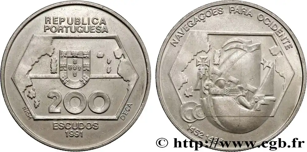 Type : 200 Escudos Navigation vers l’ouestDate : 1991Nom de l’atelier/ville : LisbonneQuantité frappée : 1500000Métal : cupro-nickelDiamètre : 36 mmAxe des coins : 6 h.Poids : 21,1 g.Tranche : canneléeRéférence ouvrage :KM20/659  – Gom.102.01 AversTitulature avers : REPUBLICA / PORTUGUESA // 200 / ESCUDOS / 1991 // INCM – D’EÇA.Description avers : vue de l’Océan Atlantique, des côtes d’Europe, d’Afrique et des Amériques, écu du Portugal.ReversTitulature revers : NAVEGAÇÕES PARA OCIDENTE // 1452 1486.Description revers : vue de l’Océan Atlantique, des côtes d’Europe, d’Afrique et des Amériques, navire à voile stylisé.HistoriquePORTUGAL
