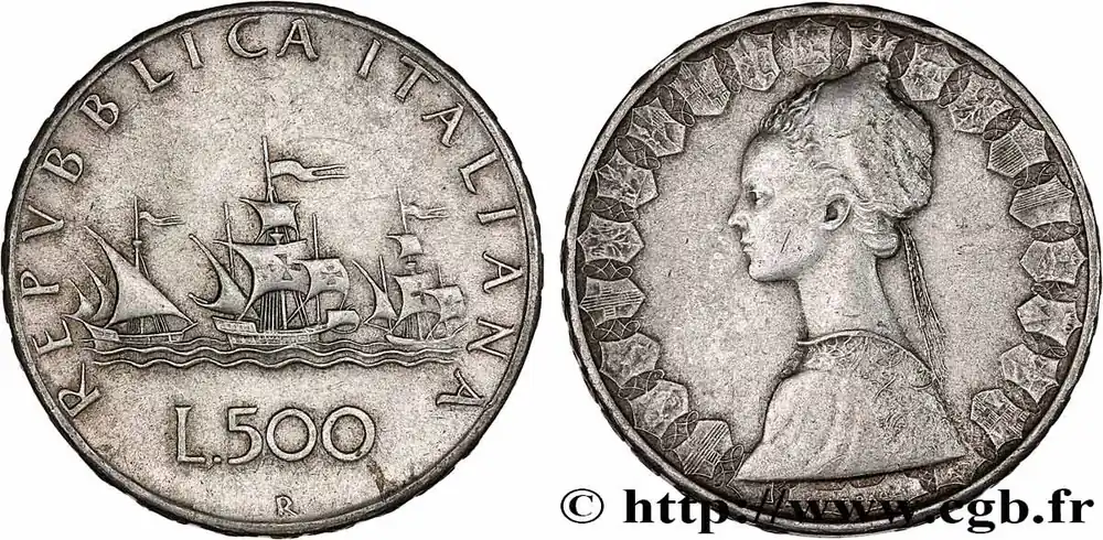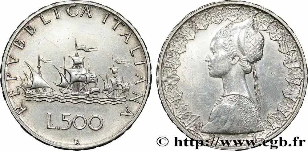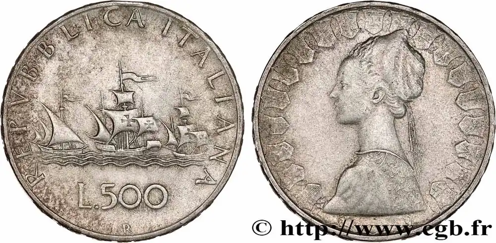 Type : 500 Lire “caravelles”Date : 1958Nom de l’atelier/ville : RomeQuantité frappée : 24240000Métal : argentTitre en millième : 835 ‰Diamètre : 29 mmAxe des coins : 6 h.Poids : 11,02 g.Tranche : en relief REPVBBLICA ITALIANA ***1958***Référence ouvrage :Mont.02 – KM20/98 AversTitulature avers : REPVBBLICA ITALIANA // VEROI // L.500 / R.Description avers : trois caravelles bannières au vent.Traduction avers : (République Italienne).ReversTitulature revers : GIAMPAOLI.Description revers : femme en habit de la renaissance / écu des villes ou provinces : Gênes, Turin, Aoste, Milan, Trente, Venese, Trieste et Udine, Bologne, Florence, Ancône, Perouse, Rome, L’Aquilée, Naples, Bari, Potenza, Catanzaro, Sicile et Cagliari.HistoriqueITALIE