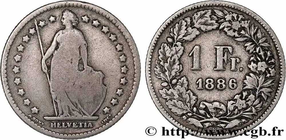 Type : 1 Franc HelvetiaDate : 1920Nom de l’atelier/ville : BerneQuantité frappée : 3300000Métal : argentTitre en millième : 835 ‰Diamètre : 23 mmAxe des coins : 6 h.Poids : 5 g.Tranche : canneléeRéférence ouvrage :KM20/24 AversTitulature avers : HELVETIA.Description avers : Helvetia debout tenant une lance et un bouclier à la croix posé à ses pieds, dans une couronne d’étoile.ReversTitulature revers : 1 FR. ET (DATE).Description revers : dans une couronne composite, de feuilles de chênes à gauche et de fleurs variées à droite.HistoriqueSUISSE