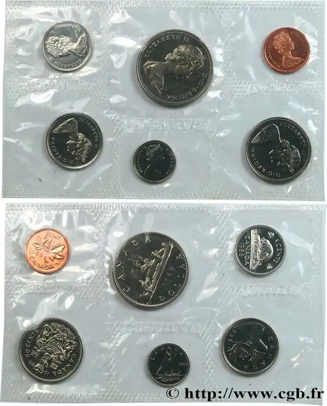 Type : Série 6 monnaiesDate : 1986Quantité frappée : —Diamètre : – mmAxe des coins : 12 h.Tranche : -Référence ouvrage :KM20/SS71 AversReversHistoriqueCANADAC’est le 15 février 1965, sur la colline du Parlement à Ottawa, que se déroule la cérémonie d’inauguration du drapeau canadien, en présence du gouverneur général Georges Vanier, du premier ministre Lester B. Pearson et des membres du Cabinet, ainsi que de milliers de citoyens. On descend d’abord le Red Ensign, portant l’Union Jack et l’écu des armoiries royales du Canada. Puis, sur le coup de midi, on hisse l’unifolié. La foule entonne ensuite l’hymne national O Canada suivi de l’hymne royal God save the Queen. Les paroles prononcées ce jour-là par Maurice Bourget, président du Sénat, donnent un sens encore plus symbolique à ce drapeau : « Le drapeau est le symbole de l’unité de la nation, car il représente sans l’ombre d’un doute tous les citoyens du Canada, sans distinction de race, de langue, de croyance ou d’opinion ».Deuxième pays du monde par sa superficie, le Canada occupe la majeure partie de l’Amérique du Nord. Il s’étend d’est en ouest de l’océan Atlantique à l’océan Pacifique et vers le nord jusqu’à l’océan Arctique et il partage deux frontières avec les États-Unis au sud et au nord-ouest (Alaska). D’abord occupé par les peuples autochtones, le pays est né de l’union de trois colonies britanniques, lesquelles étaient des colonies françaises au temps de la Nouvelle-France. Aujourd’hui c’est un État fédéral de dix provinces et trois territoires. Le Canada a obtenu son indépendance du Royaume-Uni pacifiquement dans un processus qui s’est étalé de 1867 à 1982.
