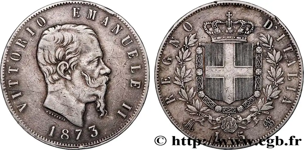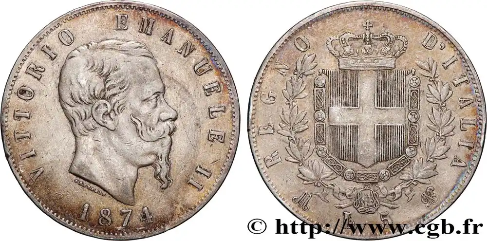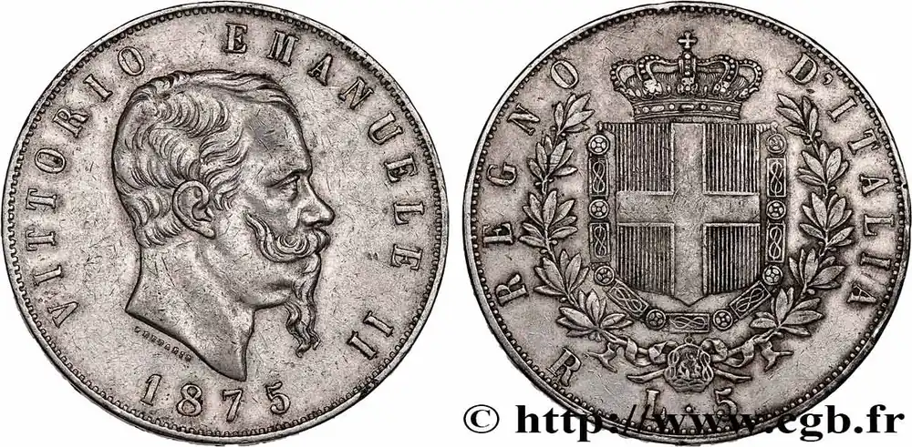 Type : 5 Lire Victor Emmanuel IIDate : 1870Nom de l’atelier/ville : MilanQuantité frappée : 5969156Métal : argentTitre en millième : 900 ‰Diamètre : 37 mmAxe des coins : 6 h.Poids : 24,51 g.Tranche : en creuxCommentaires sur l’état de conservation :Traces de nettoyageRéférence ouvrage :Mont.172  – KM19/8.3 AversTitulature avers : VITTORIO EMANUELE II.Description avers : Tête nue de Victor-Emmanuel II à droite avec signature FERRARIS ; au-dessous, le millésime.Traduction avers : (Victor-Emmanuel II).ReversTitulature revers : REGNO – D’ITALIA./ L. 5.Description revers : Écu de Savoie couronné entouré du collier de l’Ordre de l’Annonciade entre deux branches d’olivier.Traduction revers : (Royaume d’Italie).HistoriqueITALIE