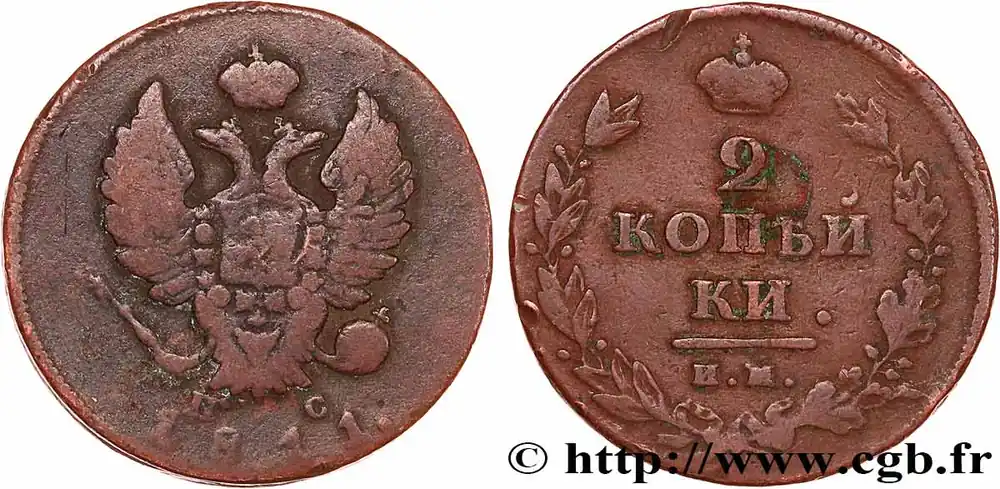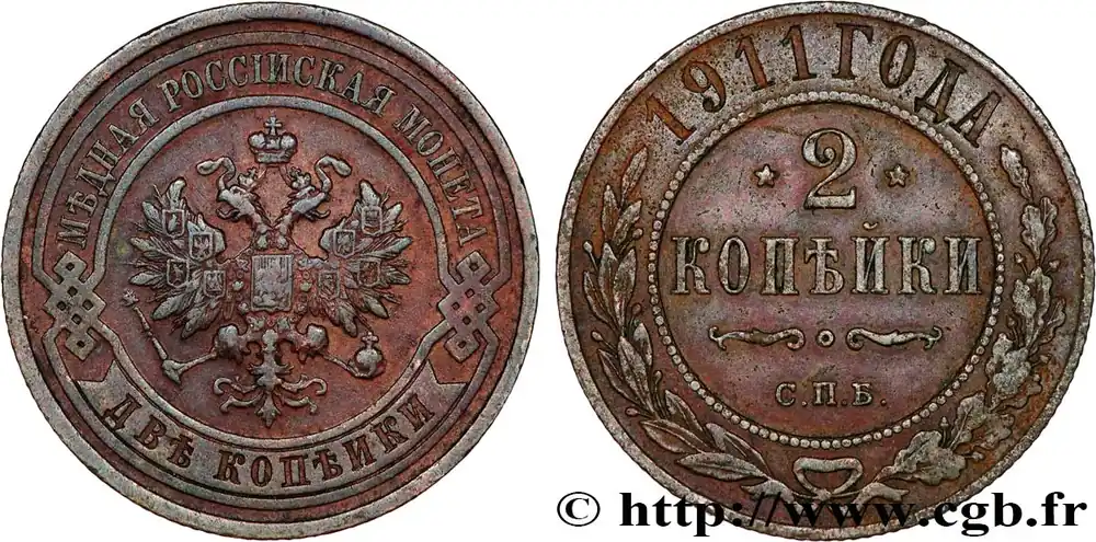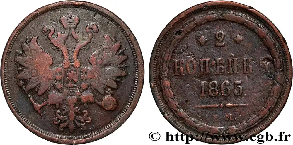 Type : 2 Kopecks aigle bicéphaleDate : 1877Nom de l’atelier/ville : Saint-PetersbourgQuantité frappée : 5010000Métal : cuivreDiamètre : 24 mmAxe des coins : 12 h.Poids : 6,40 g.Tranche : striéeRéférence ouvrage :KM.19/10.2 AversTitulature avers : (LÉGENDE EN CYRILLIQUE) МѢДНАЯ РОССІЙСКАЯ МОНЕТА // ДВѢ КОПѢЙКИ.Description avers : aigle bicéphale couronné.Traduction avers : (Monnaie de cuivre russe // Deux Kopecks).ReversTitulature revers : (LÉGENDE EN CYRILLIQUE) 1877 ГОДА / *2* / КОПѢЙКИ / С.П.Б..Description revers : entre deux rameaux.HistoriqueRUSSIE