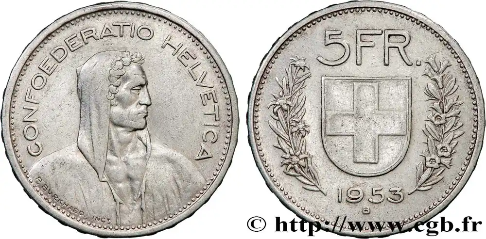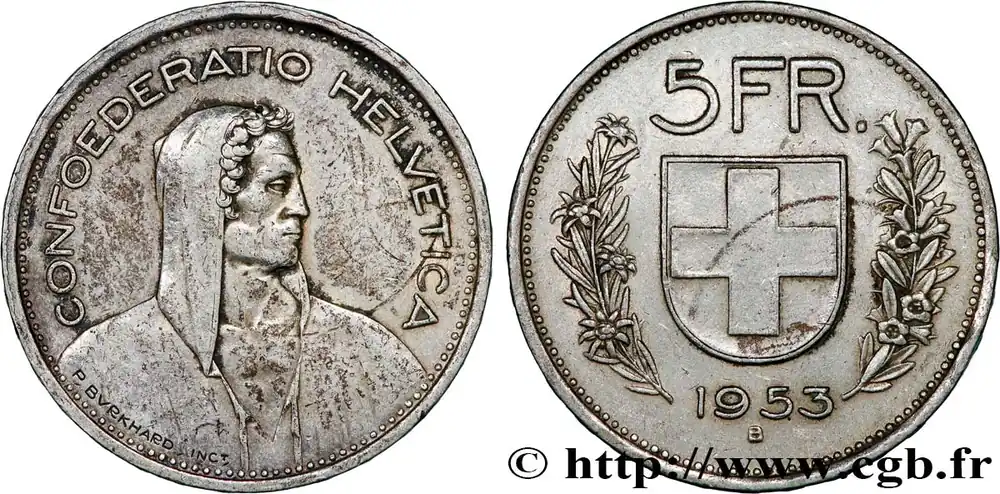 Type : 5 Francs Berger des AlpesDate : 1932Nom de l’atelier/ville : BerneQuantité frappée : 10580000Métal : argentTitre en millième : 835 ‰Diamètre : 31 mmAxe des coins : 6 h.Poids : 14,98 g.Tranche : tranche en inscrite en relief DOMINUS PROVIDEBIT *************Référence ouvrage :HMZ.2-1200b  – KM20/40 AversTitulature avers : CONFOEDERATIO HELVETICA.Description avers : Buste drapé à droite.Traduction avers : (Confédération helvétique).ReversTitulature revers : 5FR // (DATE) / B.Description revers : écu entre deux rameaux.HistoriqueSUISSE