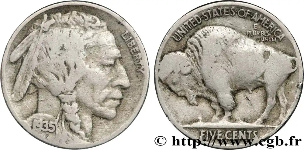 Type : 5 Cents Tête d’indien ou BuffaloDate : 1916Nom de l’atelier/ville : DenverQuantité frappée : 13333000Métal : cupro-nickelDiamètre : 21,2 mmAxe des coins : 6 h.Poids : 4,93 g.Tranche : lisseRéférence ouvrage :KM20/134 – Y.- AversTitulature avers : LIBERTY // 1916.Description avers : tête d’indien à droite.Traduction avers : (Liberté).ReversTitulature revers : UNITED STATES OF AMERICA // E / PLURIBUS / UNUM // FIVE CENTS.Description revers : bison à gauche.Traduction revers : (États-Unis d’Amérique // de plusieurs, un).CommentaireLa lettre F en creux située sous la date correspond à l’initiale du nom du graveur, James Earle Fraser. Ce type a été frappé de 1913 à 1937.HistoriqueÉTATS-UNIS D’AMÉRIQUE