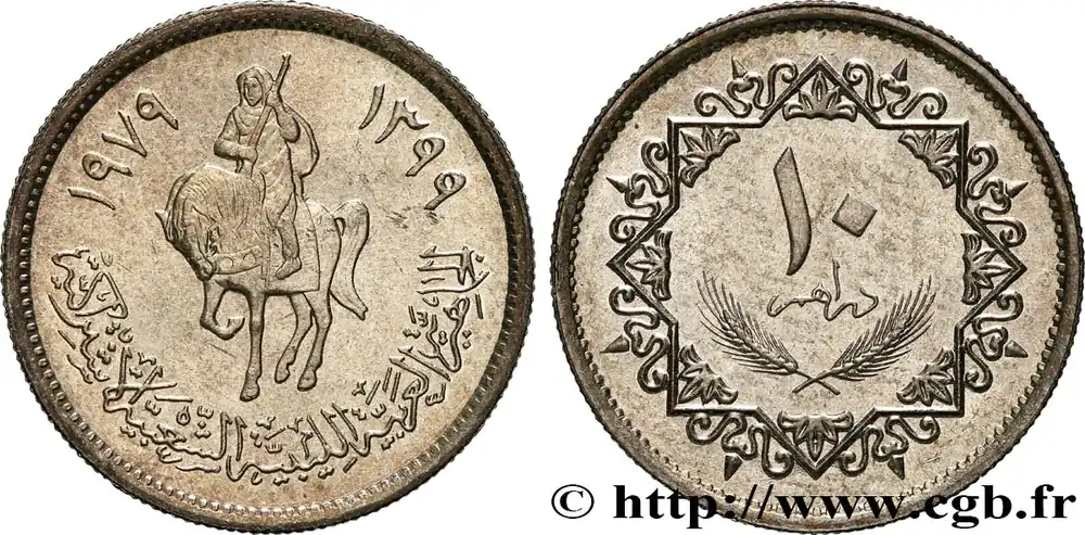 Type : 10 Dirhams cavalier AH 1399Date : 1979Quantité frappée : 4000000Métal : acier plaqué nickelDiamètre : 20 mmAxe des coins : 12 h.Tranche : canneléeRéférence ouvrage :KM20/20 AversTitulature avers : (LÉGENDE EN ARABE).Description avers : cavalier au fusil.Traduction avers : Jamahiriya arabe libyenne.ReversTitulature revers : (LÉGENDE EN ARABE).Description revers : motifs décoratifs, deux épis de blé.HistoriqueLIBYE