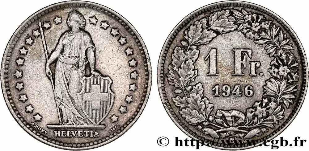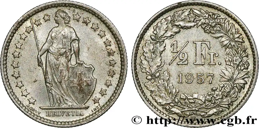Type : 1/2 Franc HelvetiaDate : 1951Nom de l’atelier/ville : Berne – BQuantité frappée : 8530000Métal : argentTitre en millième : 835 ‰Diamètre : 18,10 mmAxe des coins : 6 h.Poids : 2,50 g.Tranche : canneléeCommentaires sur l’état de conservation :coup sur trancheRéférence ouvrage :KM20/23 AversTitulature avers : HELVETIA.Description avers : Helvetia debout tenant une lance et un bouclier à la croix posé à ses pieds, dans une couronne d’étoile.ReversTitulature revers : 1/2 FR. ET (DATE).Description revers : dans une couronne composite, de feuilles de chênes à gauche et de fleurs variées à droite.HistoriqueSUISSE