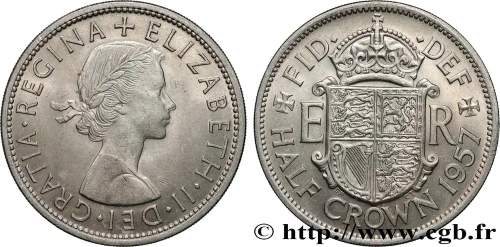 Type : 1/2 Crown Élisabeth IIDate : 1956Quantité frappée : 33934900Métal : cupro-nickelDiamètre : 32,30 mmAxe des coins : 12 h.Poids : 14,15 g.Tranche : canneléeRéférence ouvrage :Sp.4145 – KM20/907 AversTitulature avers : ELIZABETH II DEI GRATIA.REGINA+.Description avers : portrait à droite de la Reine Élisabeth II.ReversTitulature revers : FID. – DEF. // + HALF CROWN 1956 +.Description revers : écu couronné avec les initiales E-R.HistoriqueROYAUME-UNI