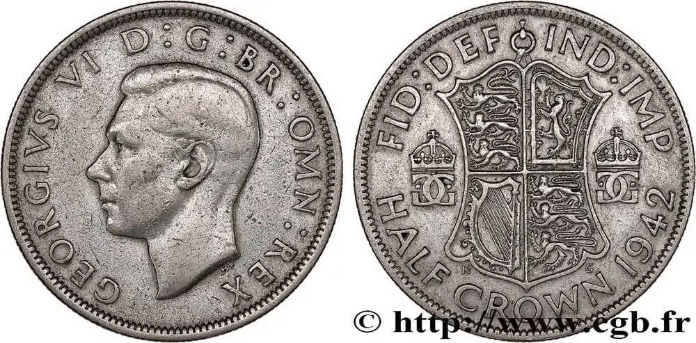 Type : 1/2 Crown Georges VIDate : 1942Quantité frappée : 31220000Métal : argentTitre en millième : 500 ‰Diamètre : 32,30 mmAxe des coins : 12 h.Poids : 14,10 g.Tranche : canneléeRéférence ouvrage :Sp.4080  – KM20/856 AversTitulature avers : GEORGIVS VI D:G:BR:OMN:REX.Description avers : portrait à gauche du roi Georges VI.ReversTitulature revers : FID:DEF-IND:IMP // HALF CROWN 1942.Description revers : lettres G entrelacées et couronnées de chaque côté d’un écu.HistoriqueROYAUME-UNI