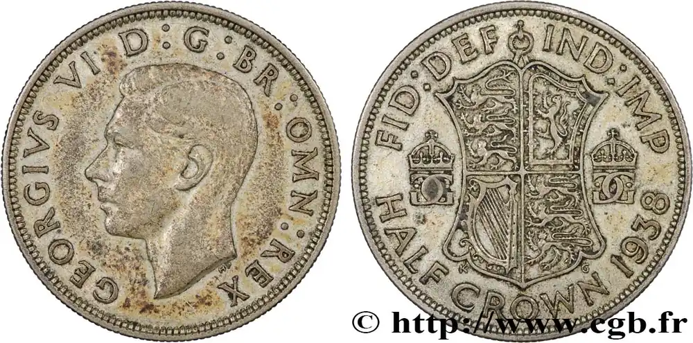 Type : 1/2 Crown Georges VIDate : 1945Quantité frappée : 18849000Métal : argentTitre en millième : 500 ‰Diamètre : 32,30 mmAxe des coins : 12 h.Poids : 16 g.Tranche : canneléeRéférence ouvrage :Sp.4080 – KM20/856 AversTitulature avers : GEORGIVS VI D:G:BR:OMN:REX.Description avers : portrait à gauche du roi Georges VI.ReversTitulature revers : FID:DEF-IND:IMP // HALF CROWN 1945.Description revers : lettres G entrelacées et couronnées de chaque côté d’un écu.HistoriqueROYAUME-UNI