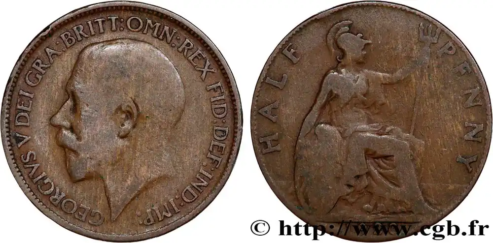 Type : 1/2 Penny Georges VDate : 1924Quantité frappée : 13971000Métal : bronzeDiamètre : 25 mmAxe des coins : 12 h.Poids : 5,65 g.Tranche : lisseCommentaires sur l’état de conservation :la monnaie présente des traces de nettoyageRéférence ouvrage :Sp.4056 – KM20/809 AversTitulature avers : GEORGIVS V DEI GRA:BRITT:OMN:REX FID:DEF:IND:IMP.Description avers : Buste couronné à gauche de Georges V.Traduction avers : (Georges V Roi de toutes les Bretagnes par la grâce de Dieu Défenseur de la foi, Empereur des Indes).ReversTitulature revers : HALF PENNY/ 1924.Description revers : Britannia assise à droite.HistoriqueROYAUME-UNI