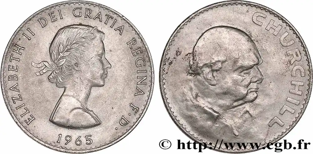 Type : 1 Crown Winston ChurchillDate : 1965Quantité frappée : 9640000Métal : cupro-nickelDiamètre : 38,61 mmAxe des coins : 12 h.Poids : 28,47 g.Tranche : striéeRéférence ouvrage :KM20/910 AversTitulature avers : ELIZABETH II DEI GRATIA REGINA D. F. / 1965.Description avers : Buste à droite lauré de la reine Élisabeth II.ReversTitulature revers : CHURCHILL.Description revers : portrait de trois quart à droite de Winston Churchill.HistoriqueROYAUME-UNI